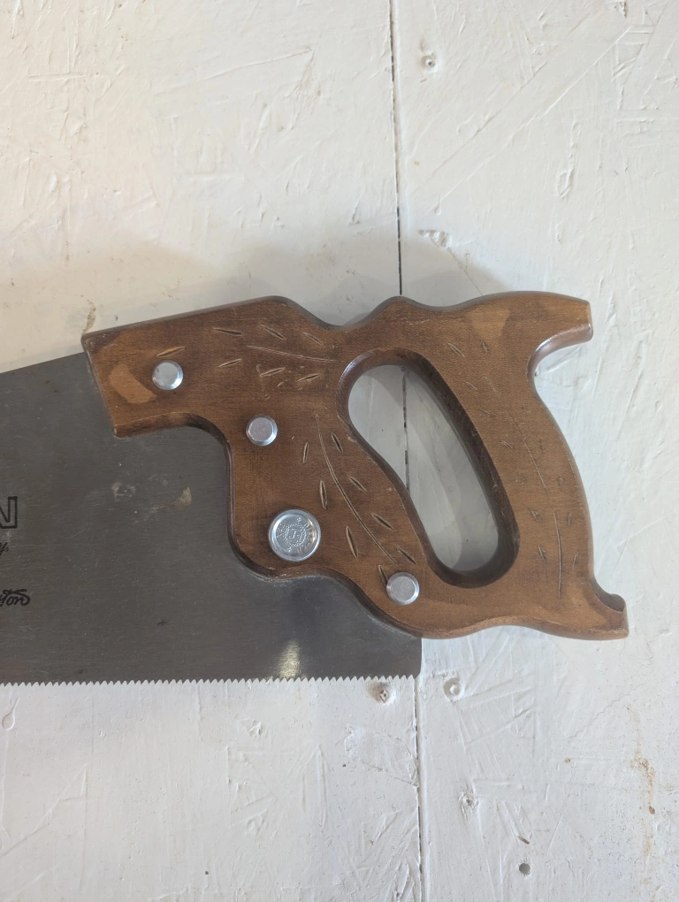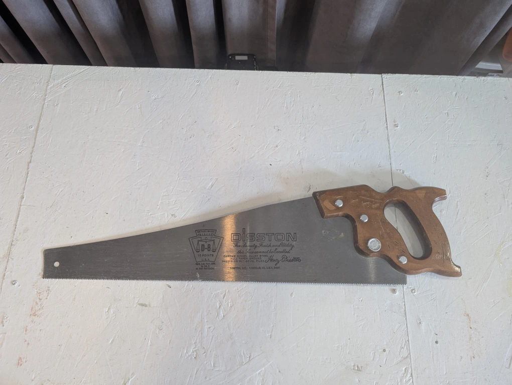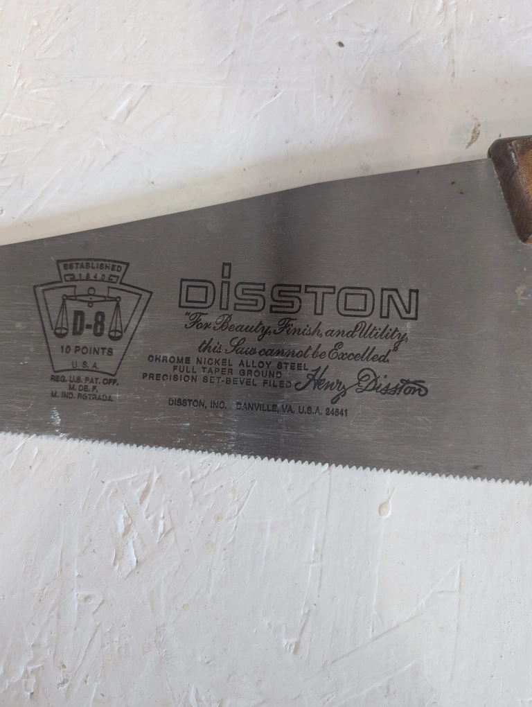 Selling a Disston hand saw. It's marked with "For Beauty, Finish, and Utility, this Saw cannot be Excelled". It also says Chrome Nickel Alloy Steel, Full Taper Ground, Precision Set-Bevel Filed.