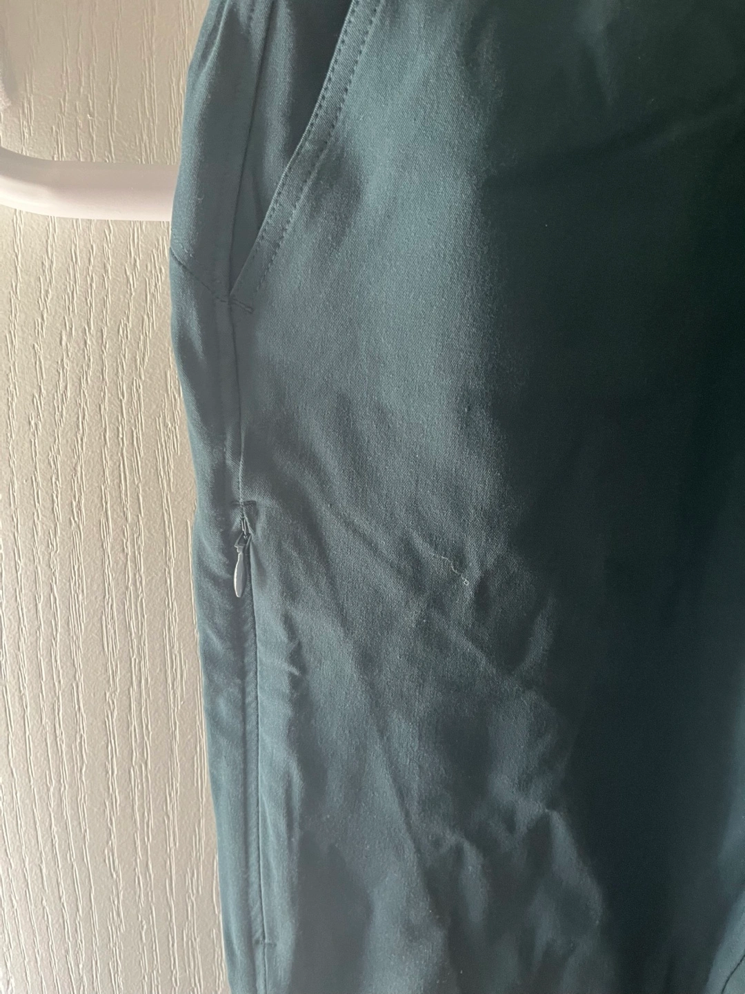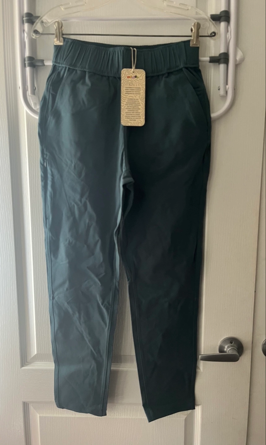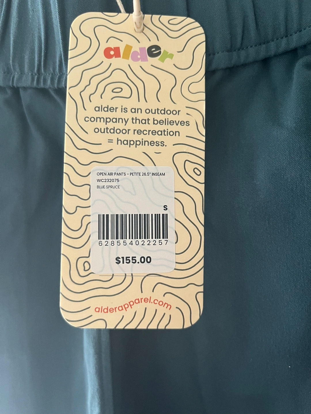 These Alder Open Air Pants are in Blue Spruce , petite size small with a 26.5" inseam. They sat in my closet for a while and unfortunately aren’t my size anymore . Looking to give them a good home :)