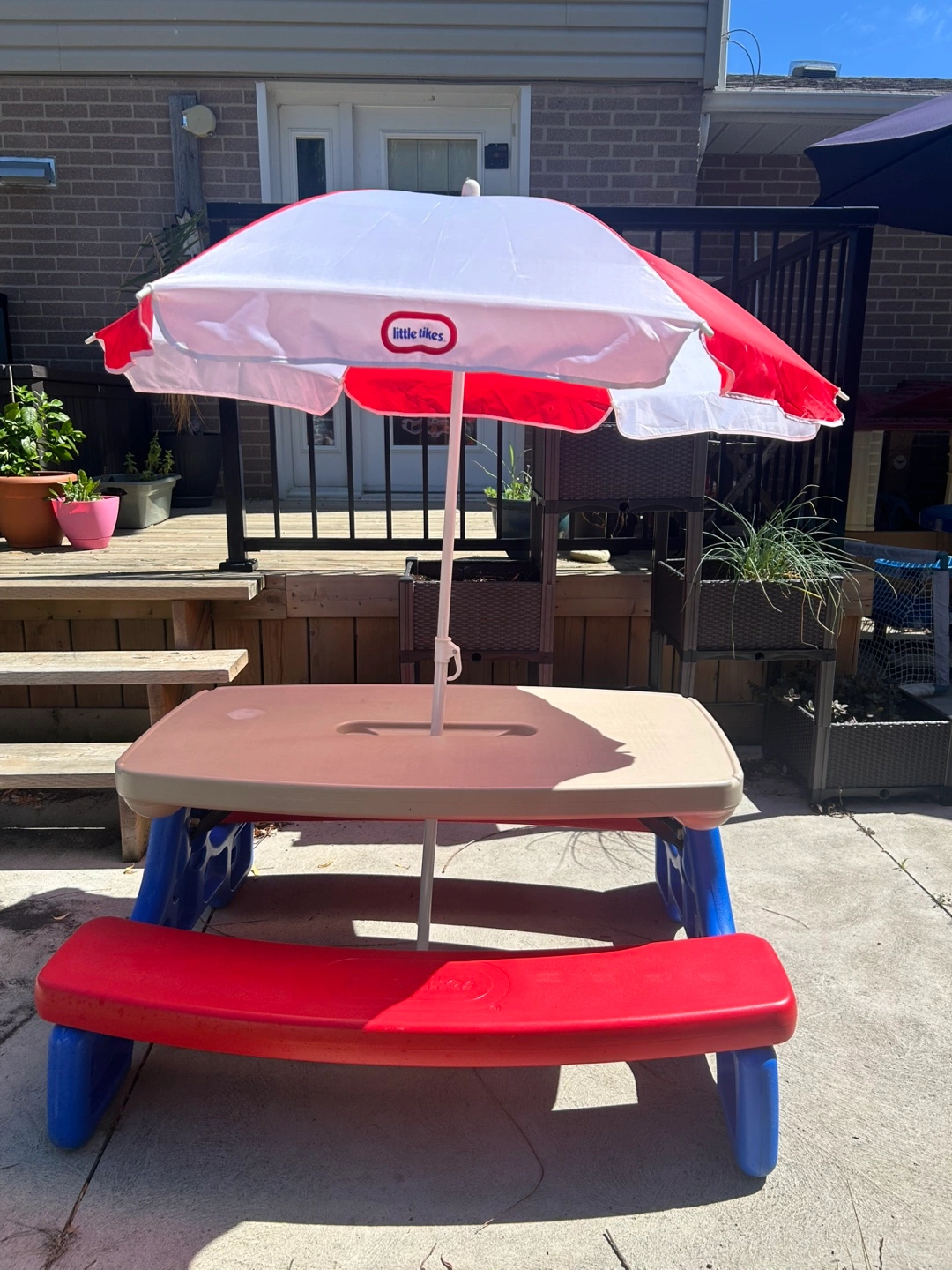 Selling a Little Tikes picnic table, perfect for kids! It comes with a cute umbrella to keep them shaded on sunny days. The table has a red, blue, and beige colour scheme. It's in good condition and ready for a new home!