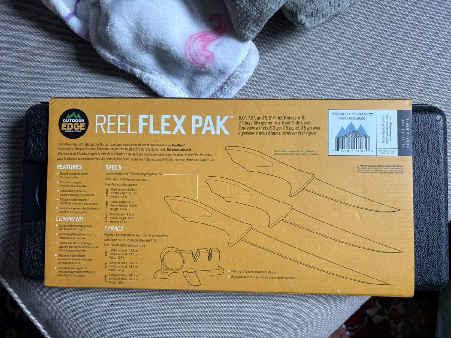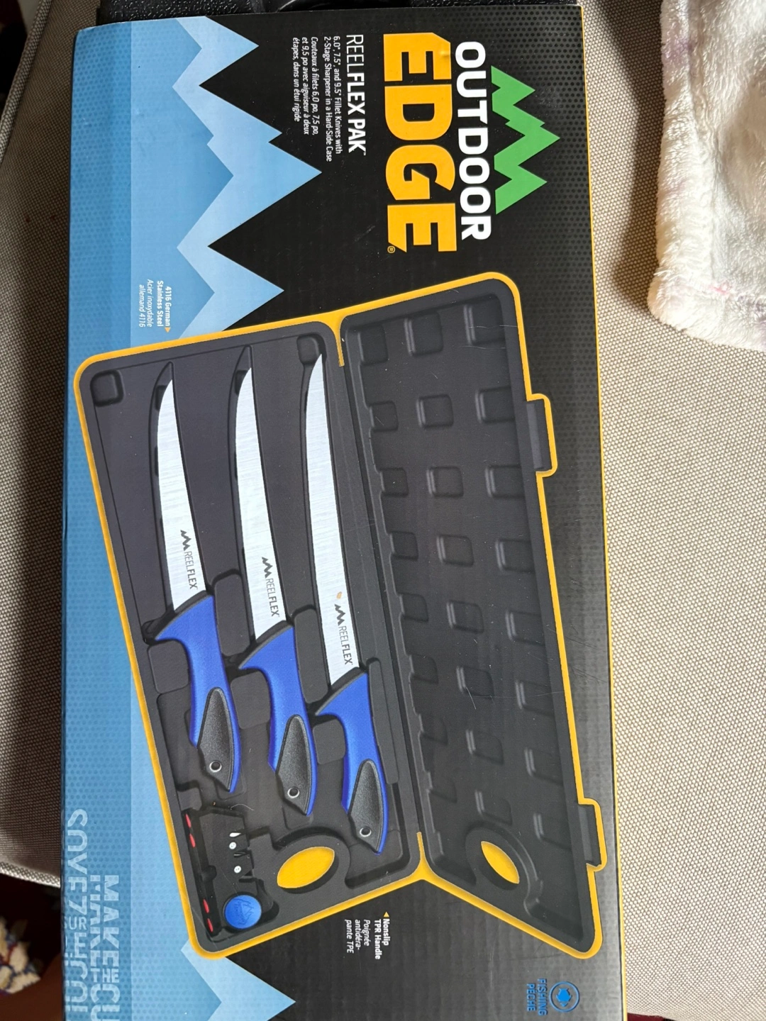 Outdoor Edge Reel Flex Pak, featuring 6.0", 7.5", and 9.5" fillet knives with a hard-side case. Perfect for filleting your catch! Comes with a floating base for maximum stability. The knives have German stainless steel blades and a comfortable TPE handle. In the box each one