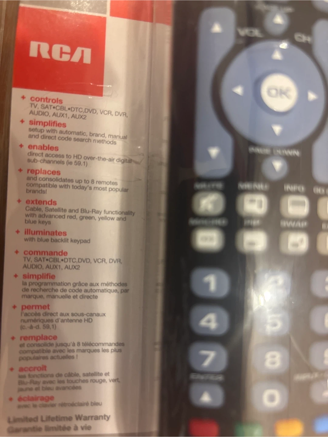 A brand new RCA universal remote, still sealed in its original packaging! It's an 8-device remote, compatible with a wide range of devices. Features include a blue backlit keypad and supports over 400 brands. Simplify your home entertainment setup with this easy-to-use remote!