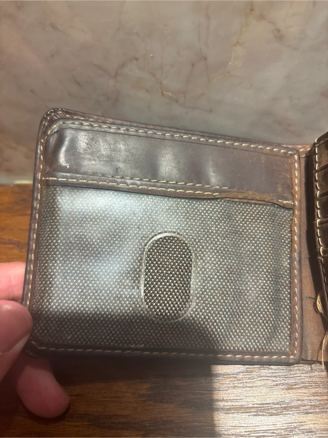 Gently used Fossil brown leather wallet with card slots and bill compartment. Shows some wear but still has lots of life left!