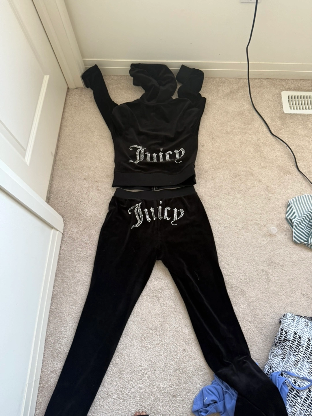 Selling a gently used Juicy Couture black velour tracksuit. It's in great condition and super comfy! The set includes both the zip-up hoodie and the pants, both with the classic Juicy logo in rhinestones. Perfect for lounging or running errands in style!