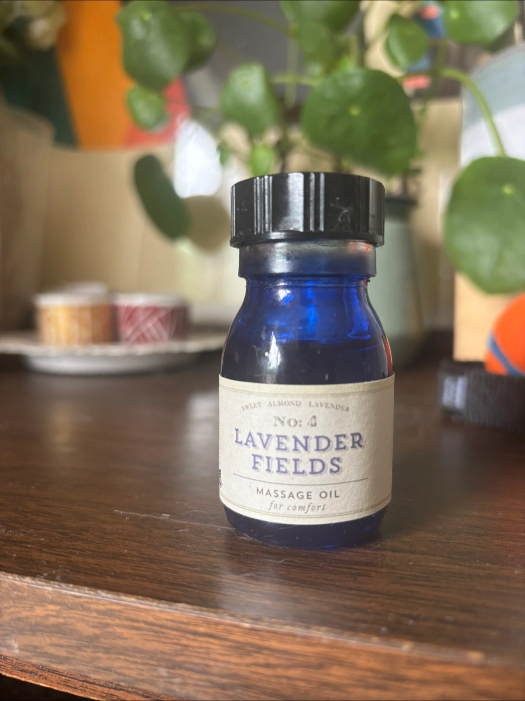 Selling a bottle of Lavender Fields Massage Oil for comfort. It's a sweet almond and lavender blend, perfect for relaxation