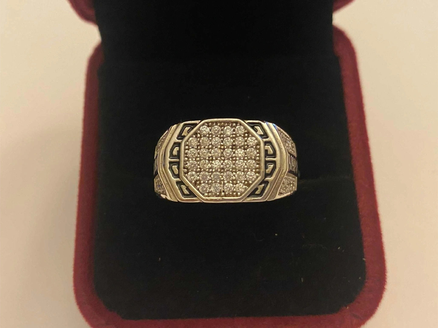 Selling a men's ring with cubic accents. It's new and comes with the box. Silver weigh 7.4grams with cubic zirconia, size 10