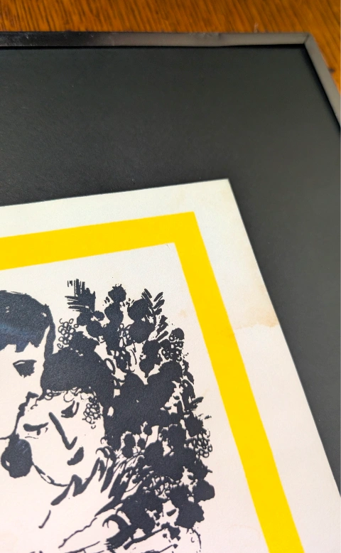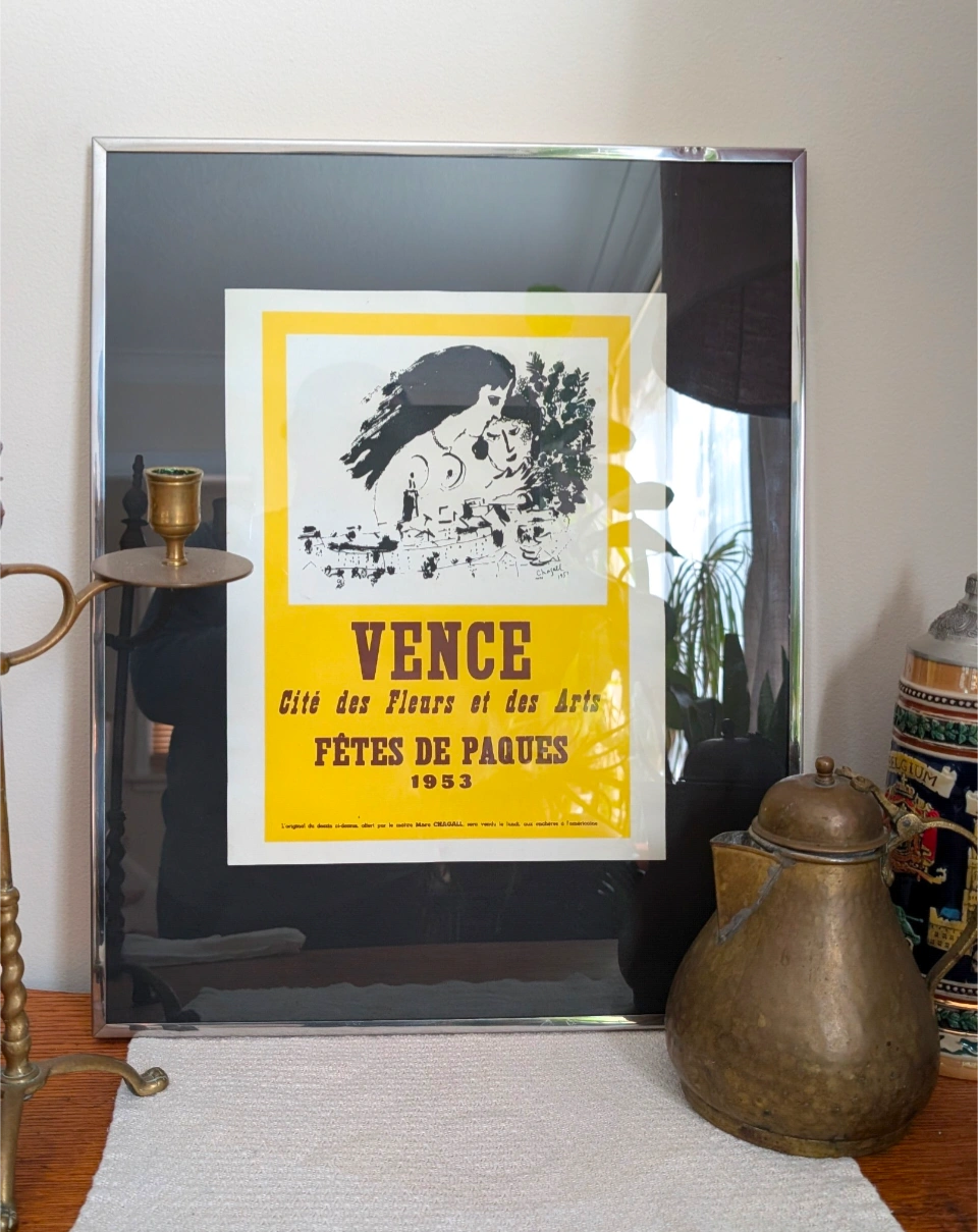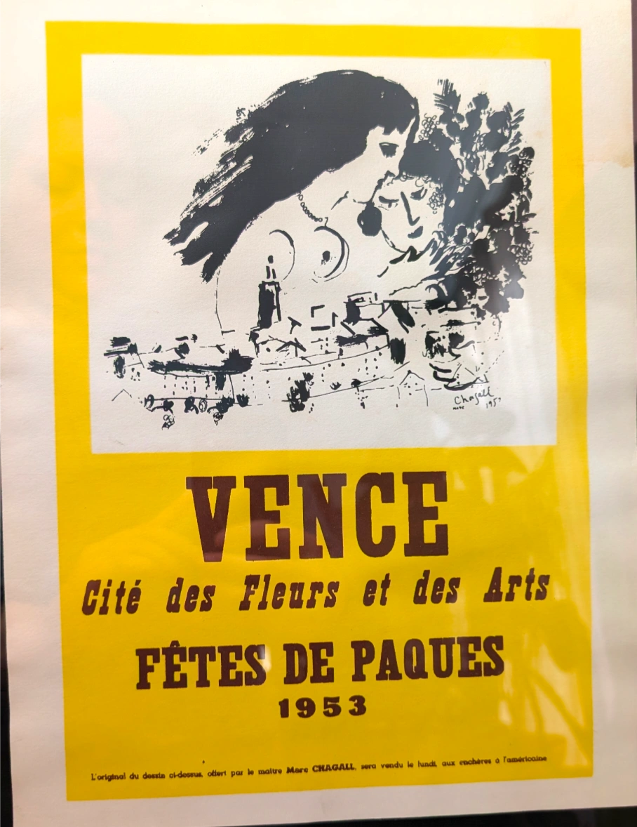 Framed poster featuring Vence, Cité des Fleurs et des Arts, Fêtes de Paques 1953. The frame has some wear and tear, as shown in the photos.