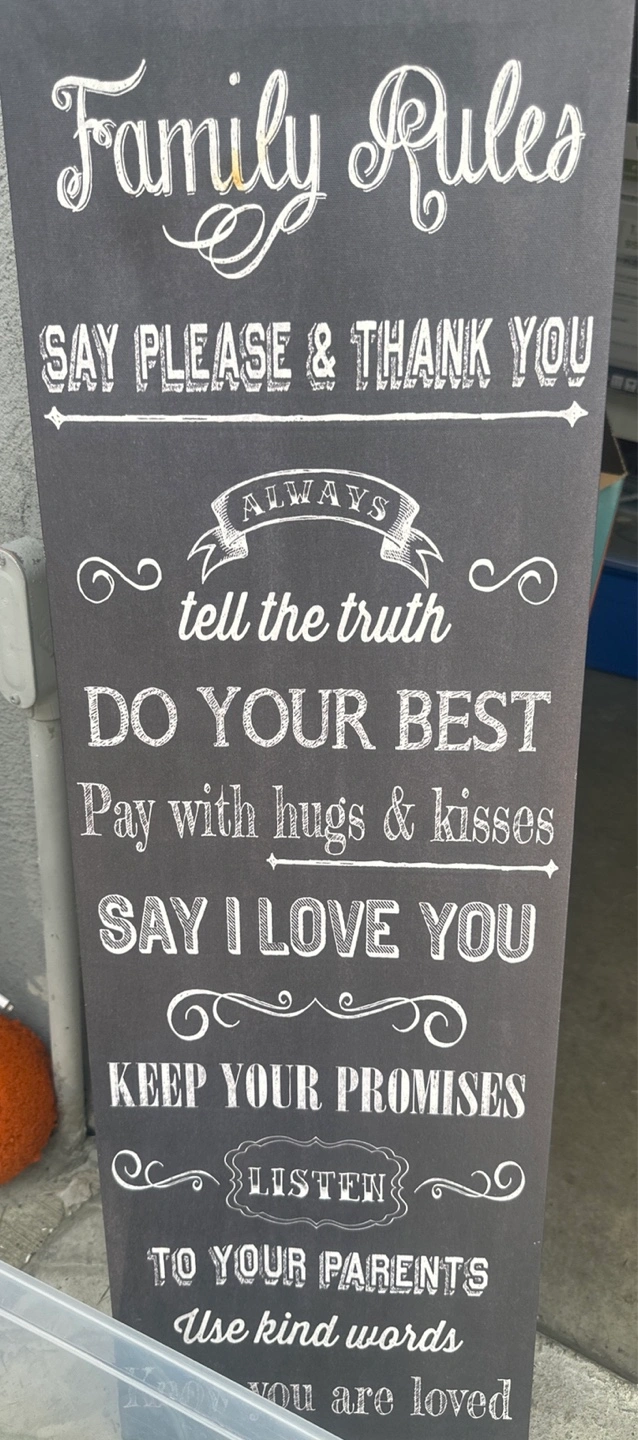 75A cute sign with "Family Rules" written on it! It lists sayings like "Say Please & Thank You", "Always tell the truth", and "Say I Love You". A sweet addition to any home
