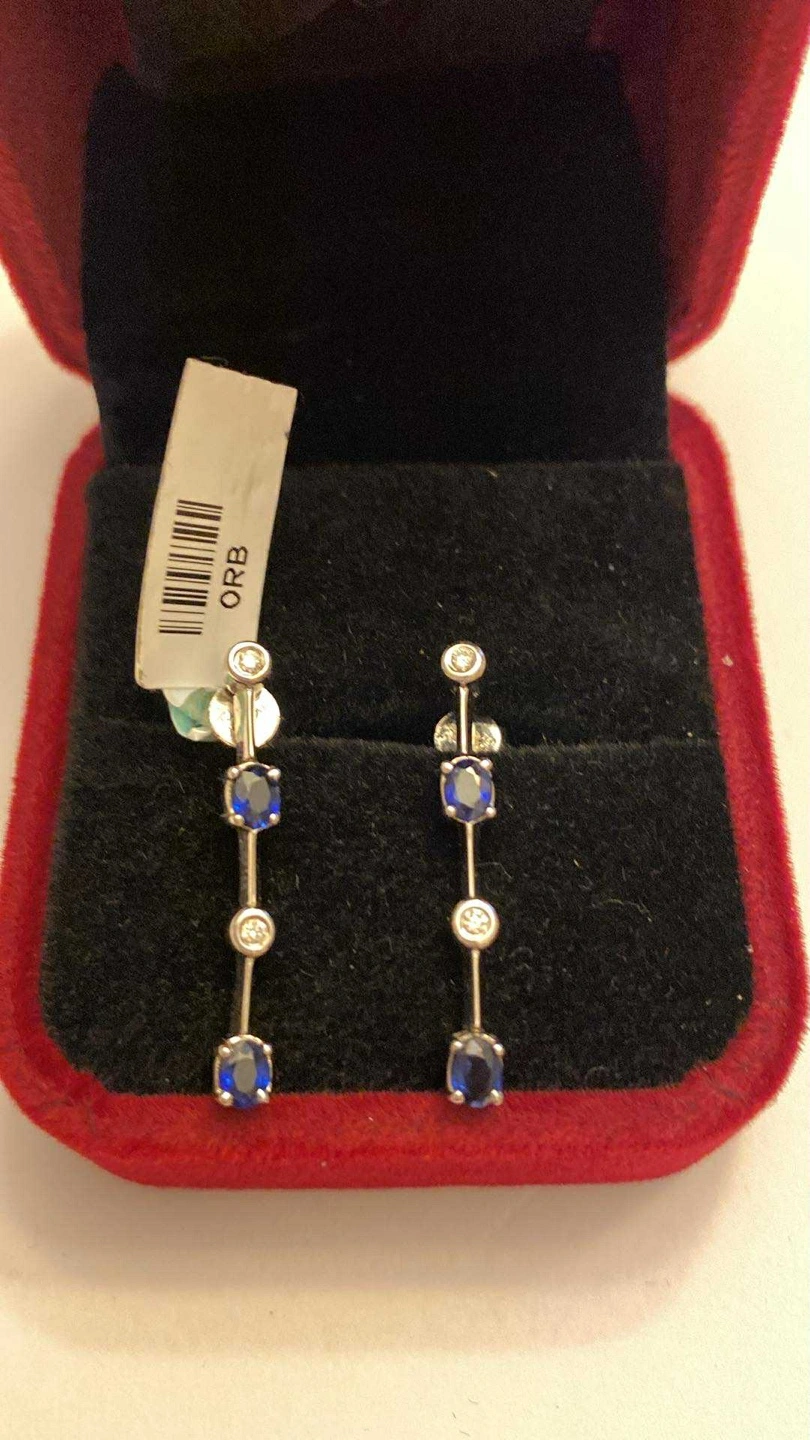 Beautiful dangle earrings featuring sapphires and diamonds. They come in a lovely red box, perfect for gifting or safekeeping! Earrings 14k white gold with diamonds and real blue sapphire