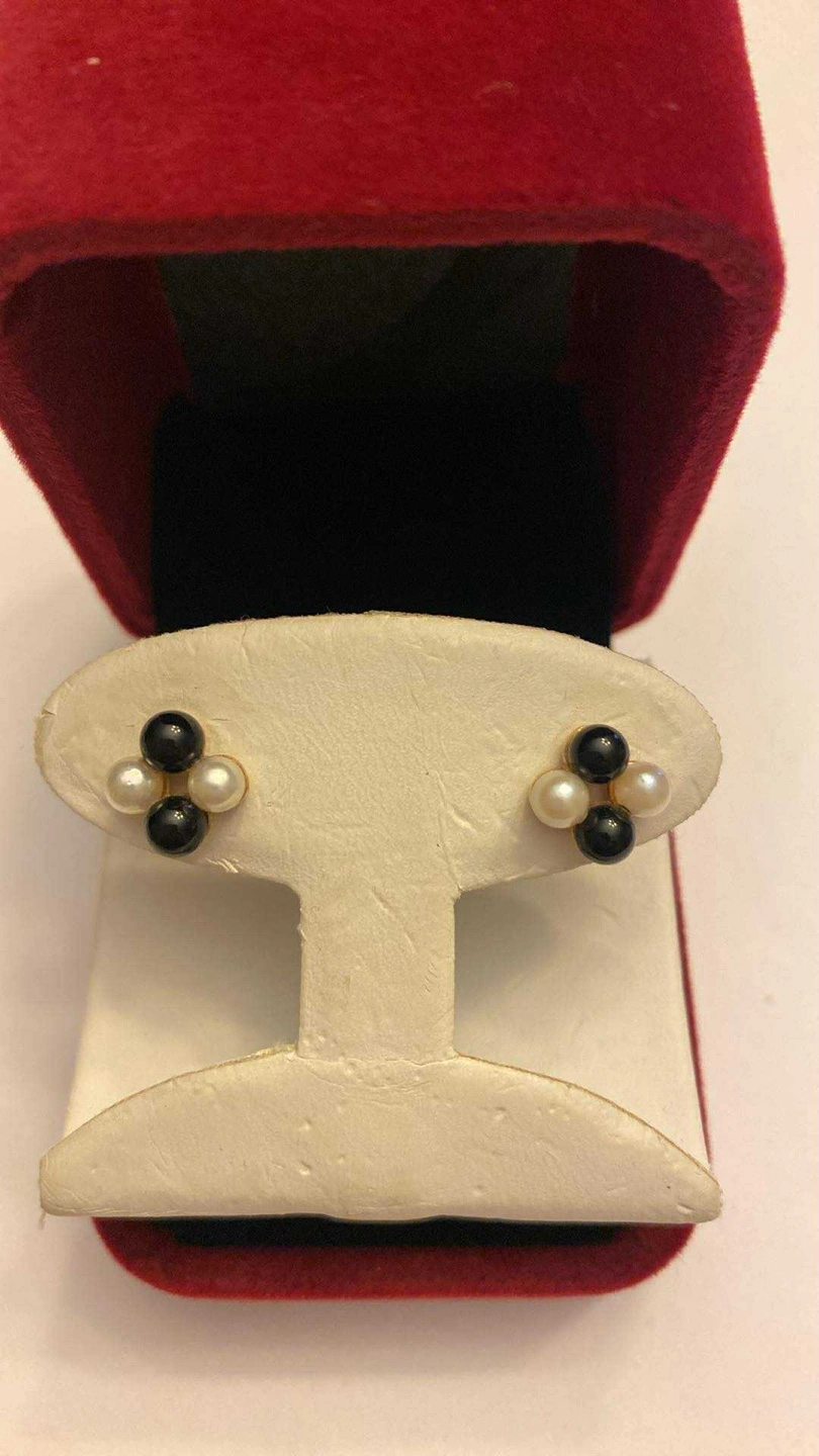 Cute pearl stud earrings with a unique black and white design! They come in a red velvet box, perfect for gifting or keeping them safe. 10k yellow gold earrings pearl and black onyx