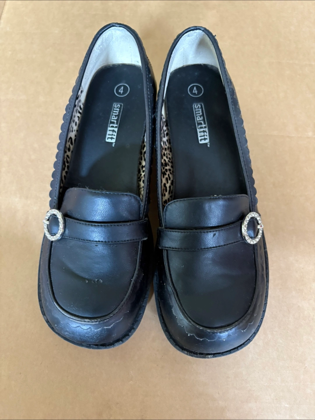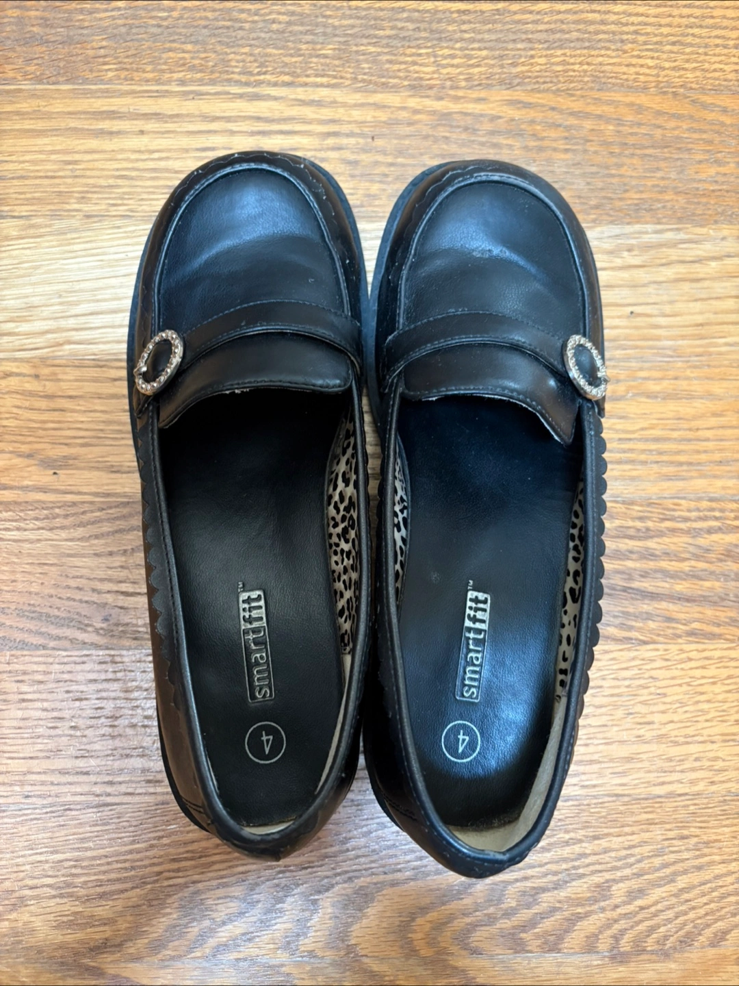 Step into style with these Smartfit black loafers, perfect for juniors. In a versatile Size 4, these shoes are skid resistant and in good condition. Just in time for back to school.