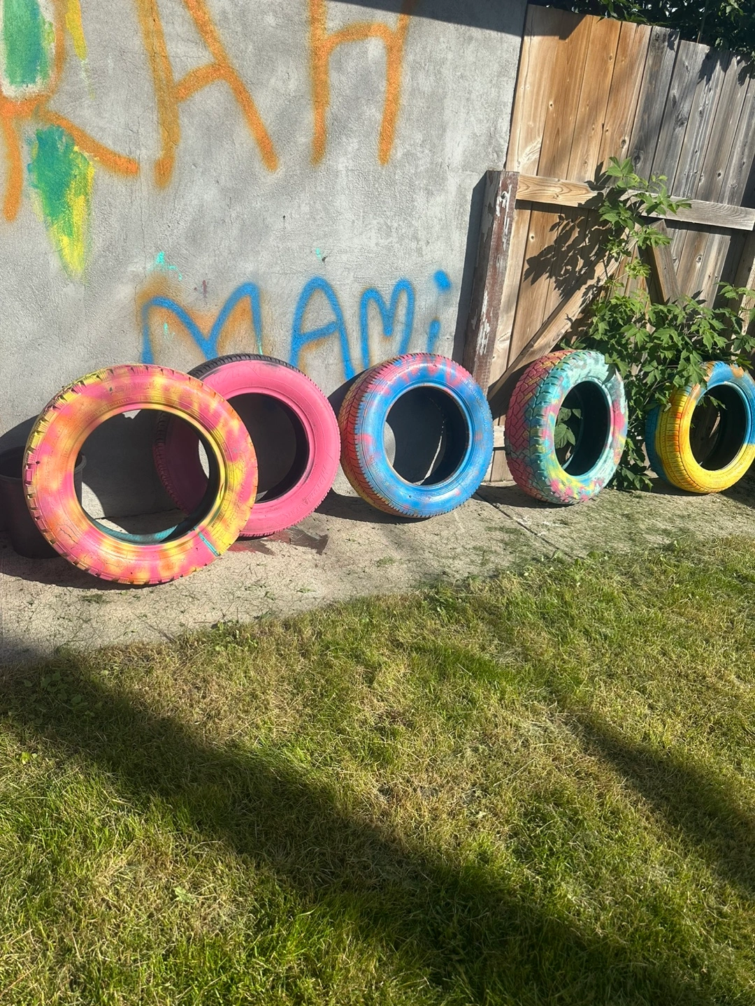 Looking to add a splash of colour to your garden or play area? I have a collection of painted tires in various colours and patterns. They're perfect for creating fun obstacles, planters, or just adding a unique touch to your outdoor space