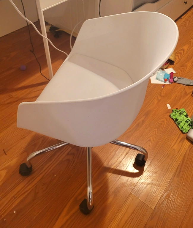 Selling a white swivel office chair. It's in good condition and perfect for a home office or study space. The chair has a comfortable seat and a sturdy base with smooth-rolling casters. It has some minor spots as it was owned by an art supply and make up weilding teenager. Pick up only.