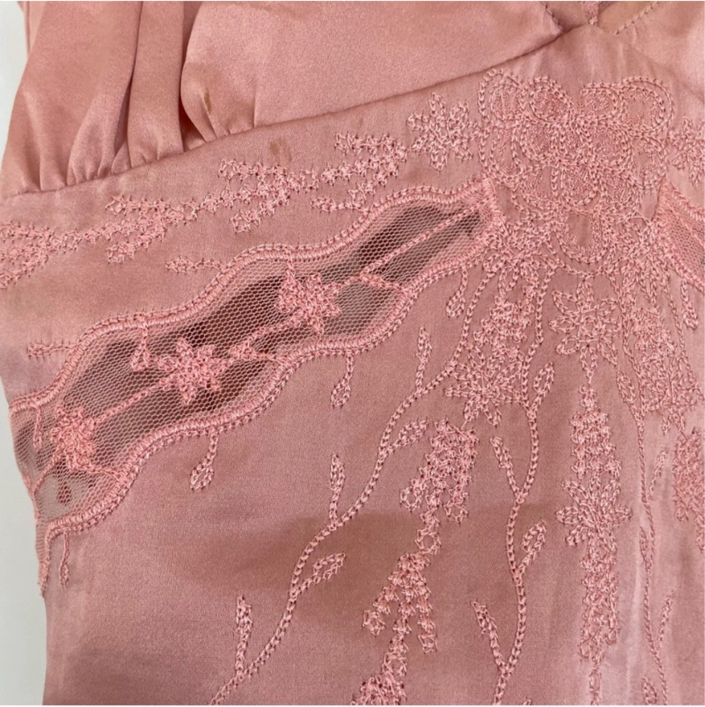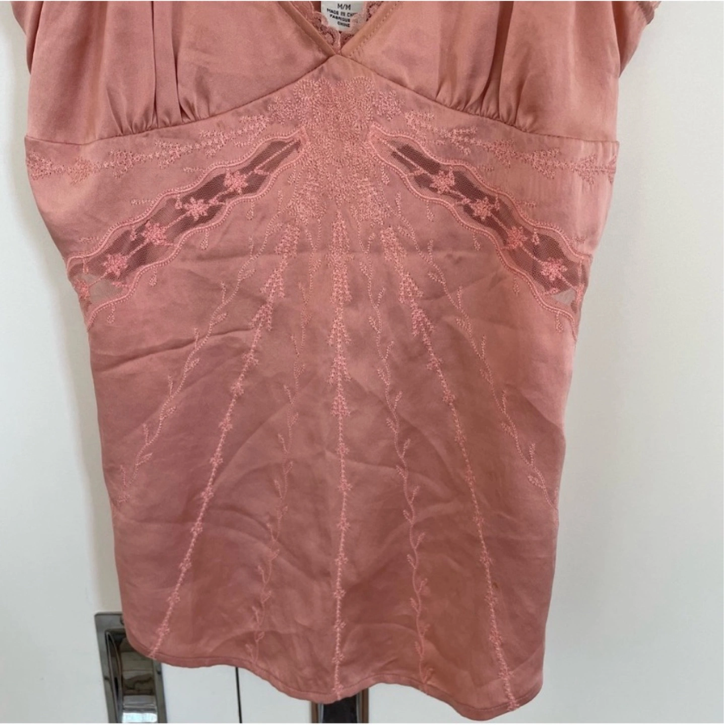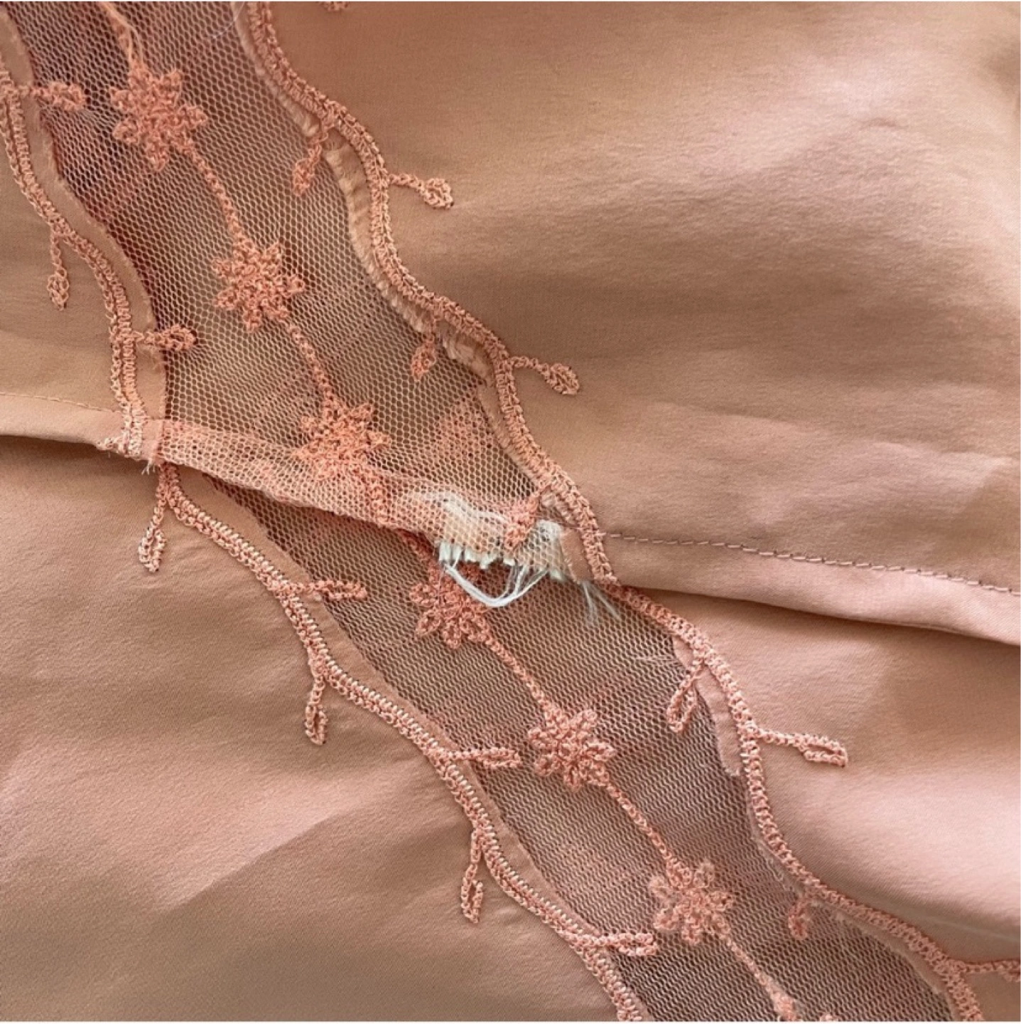 Salmon/pink colour with lace cutouts and embroidered derailing