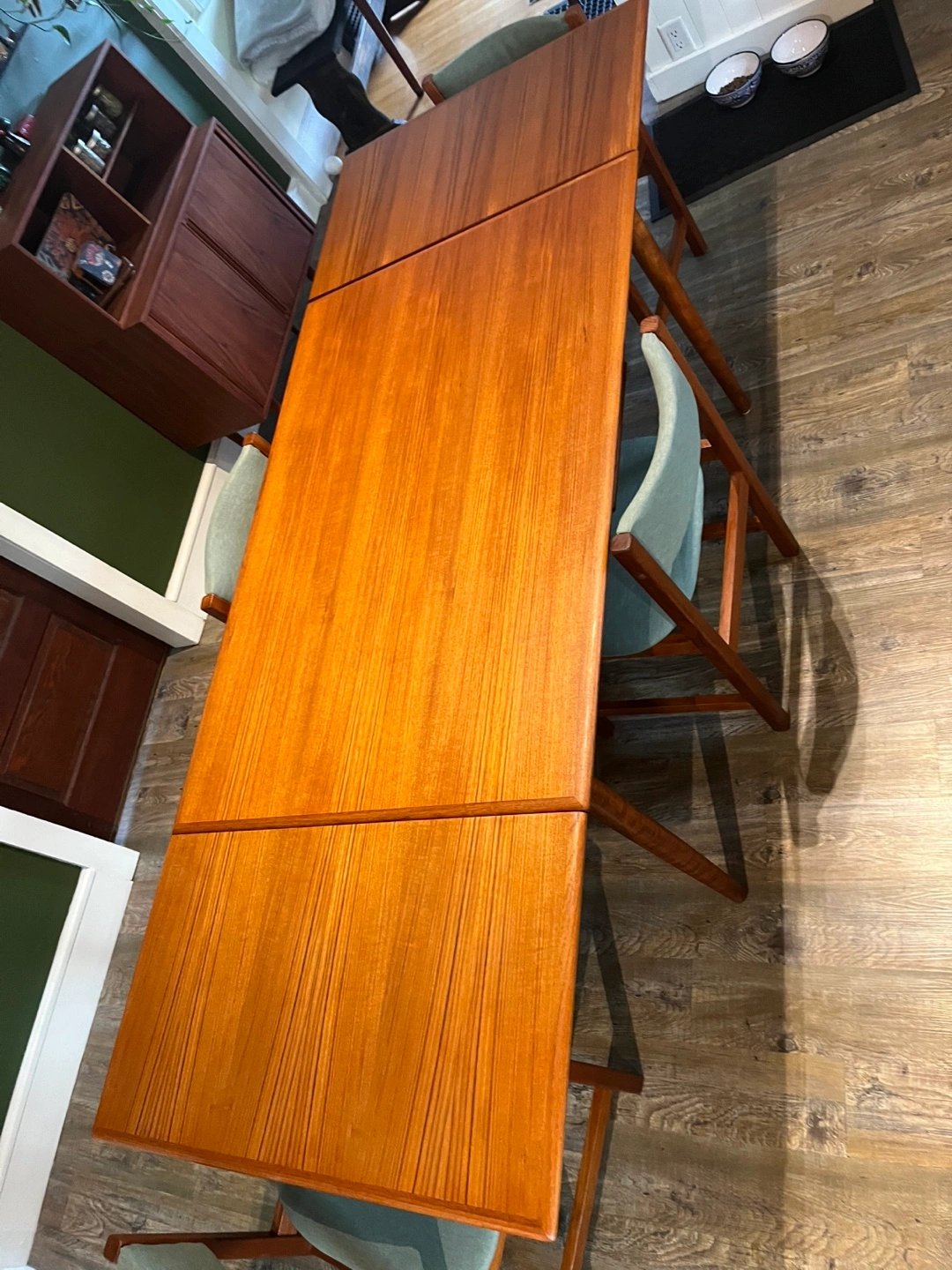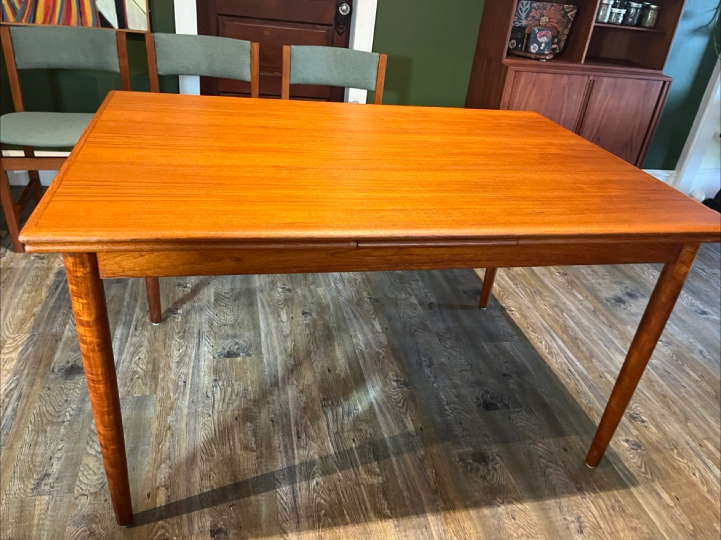 This gorgeous set is true to the Danish modern method and is practical as it is aesthetically pleasing. The extendable leaves can easily be slid underneath the main portion going from seating 10 guests to 4-6 with no extra hands needed and no extra storage, they smoothly slide under the main table effortlessly.
