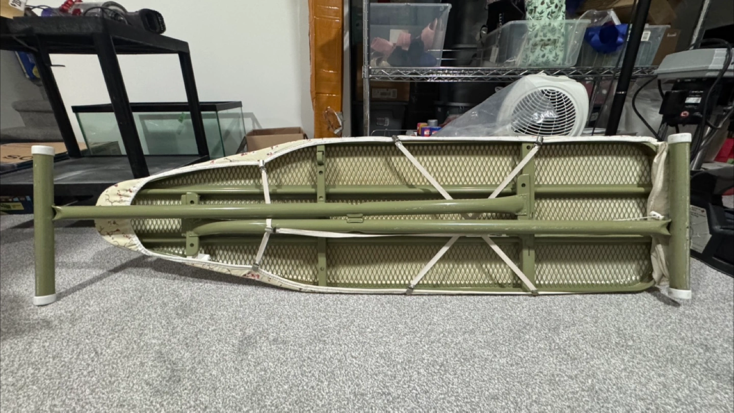 Selling a used ironing board with a beige floral pattern. It's in good condition and ready for a new home. Perfect for getting those clothes wrinkle-free!