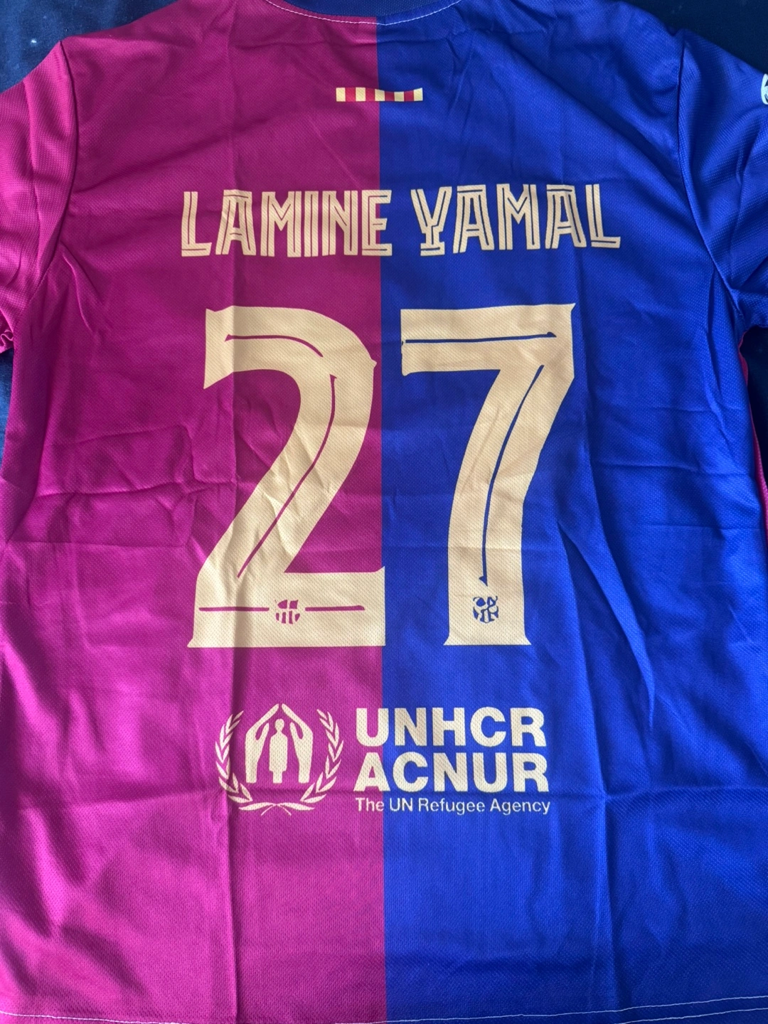 54Selling a FC Barcelona jersey with Lamine Yamal's name and number 27 on the back. The jersey features the Spotify logo on the front and the UNHCR ACNUR logo on the back. Great for any Barca fan!
