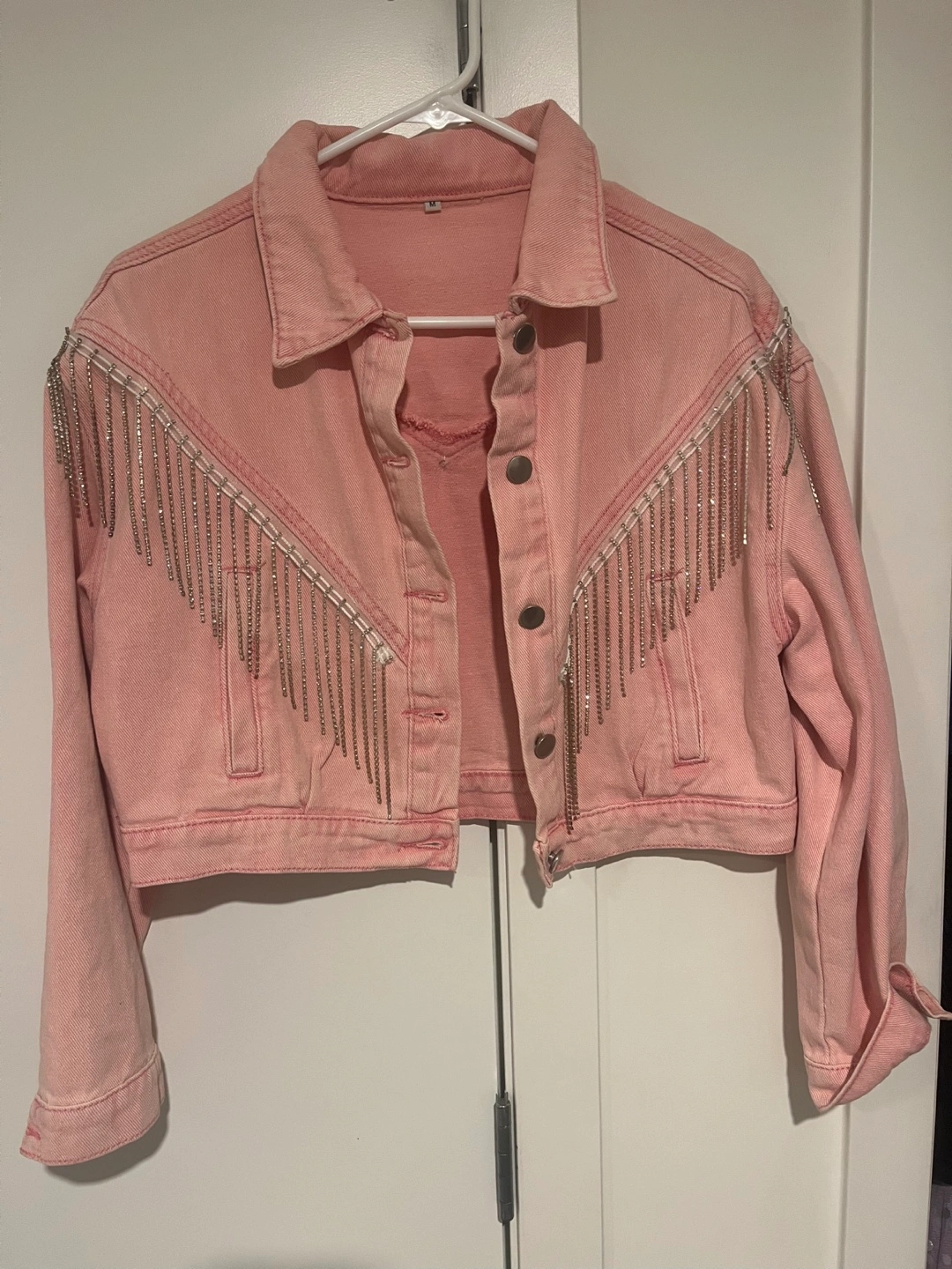 Selling a cute pink denim jacket with silver fringe detailing! It's in great condition and perfect for adding a bit of sparkle to your outfit 💖