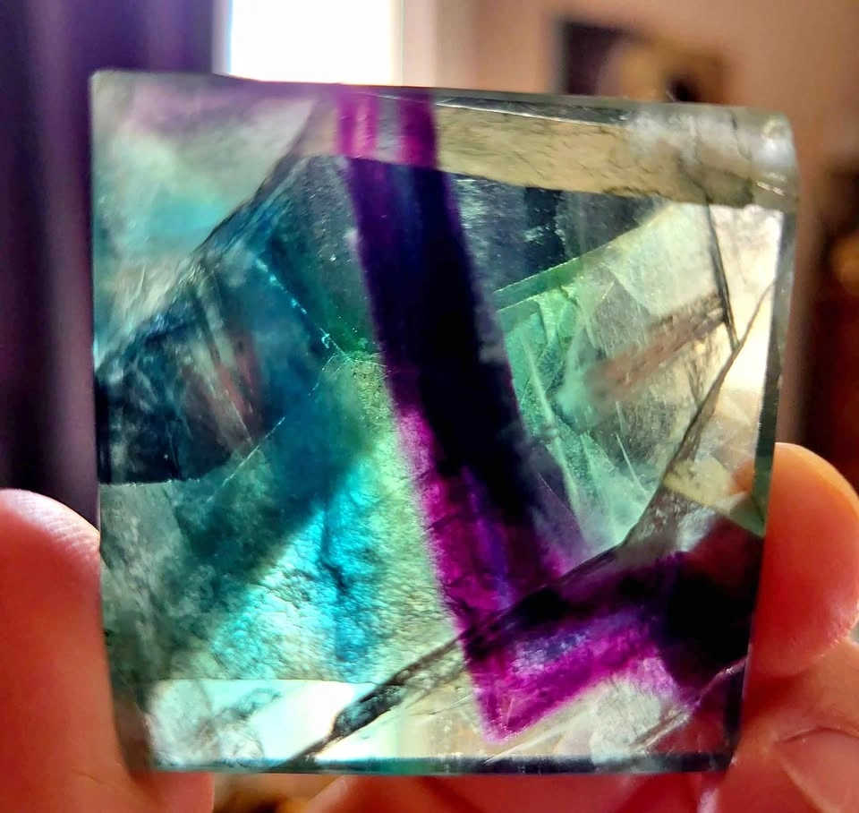 Beautiful rainbow Fluorite pyramid, with lots of blue and the perfect dark purple stripe. Gorgeous display piece.