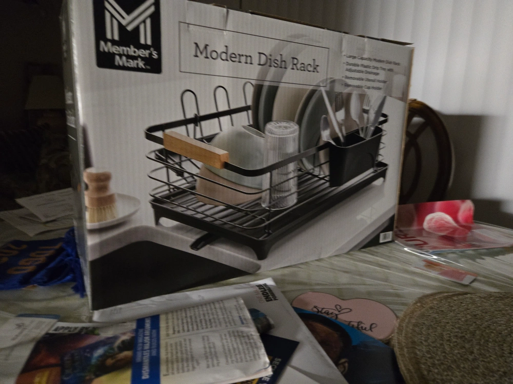 74Selling a Member's Mark Modern Dish Rack! It features a large capacity design and a durable plastic drip tray with adjustable drainage. It also has a removable utensil holder and a removable cup holder!