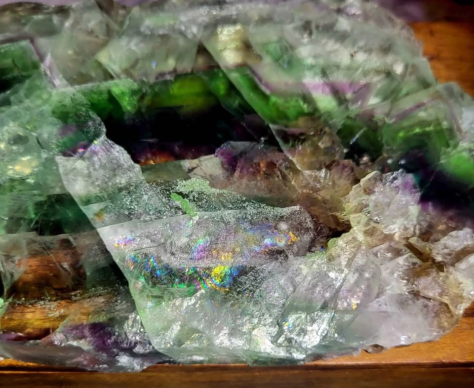Gorgeous large rainbow Fluorite slab. This piece has tons of flashy rainbows. It has beautiful greens and purples along with bright yellows along with rare clear Fluorite. This one is 7 inches by 5 inches and half an inch thick, it is not a small piece.