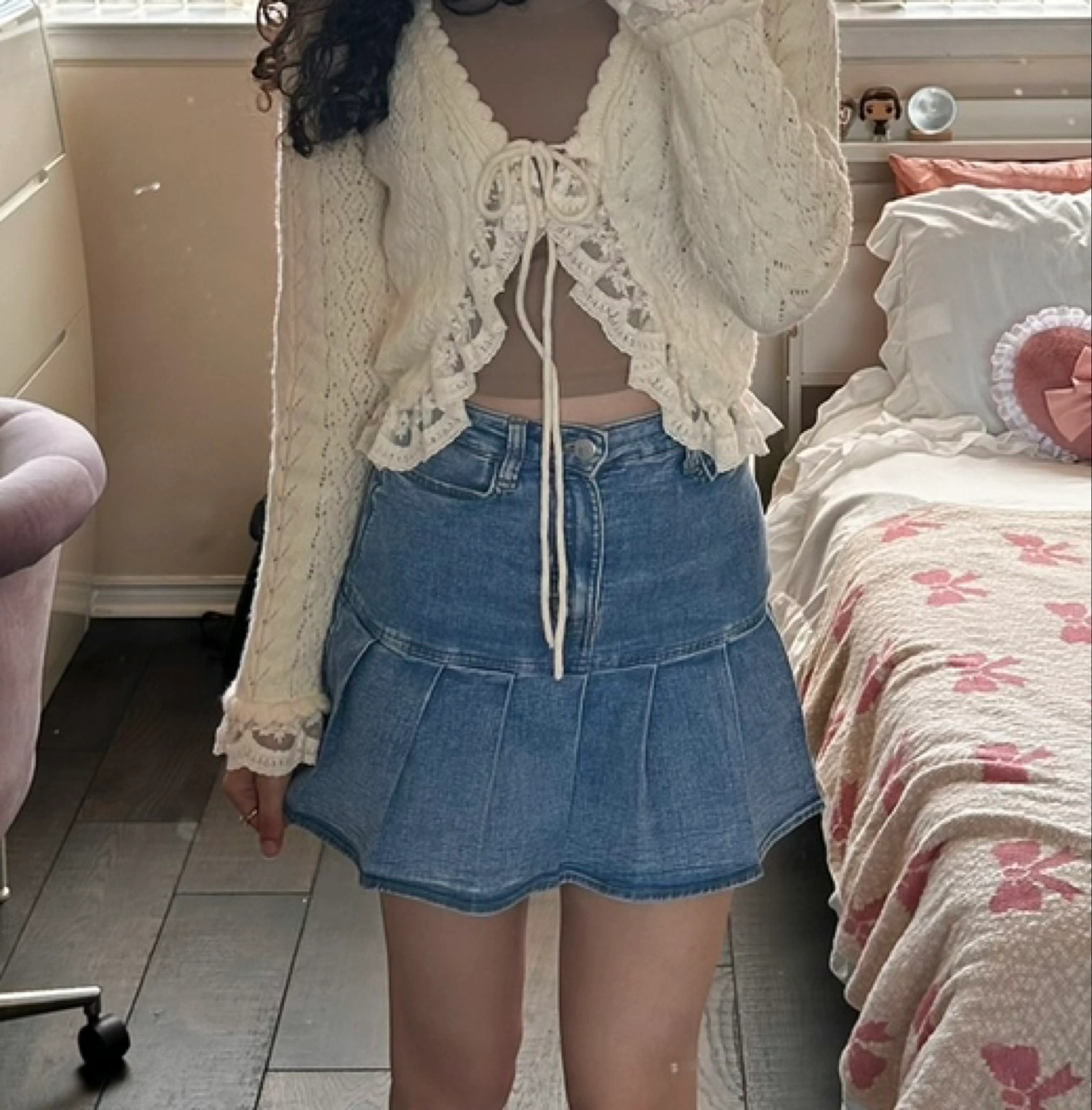 Cute denim mini skirt with pleats! It's in great condition and has heart-shaped pockets on the back.