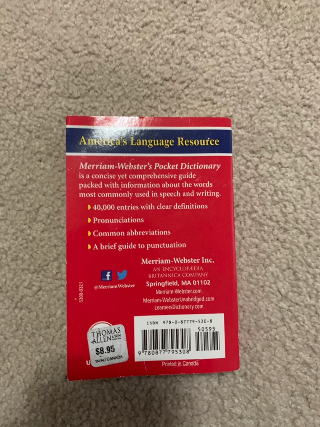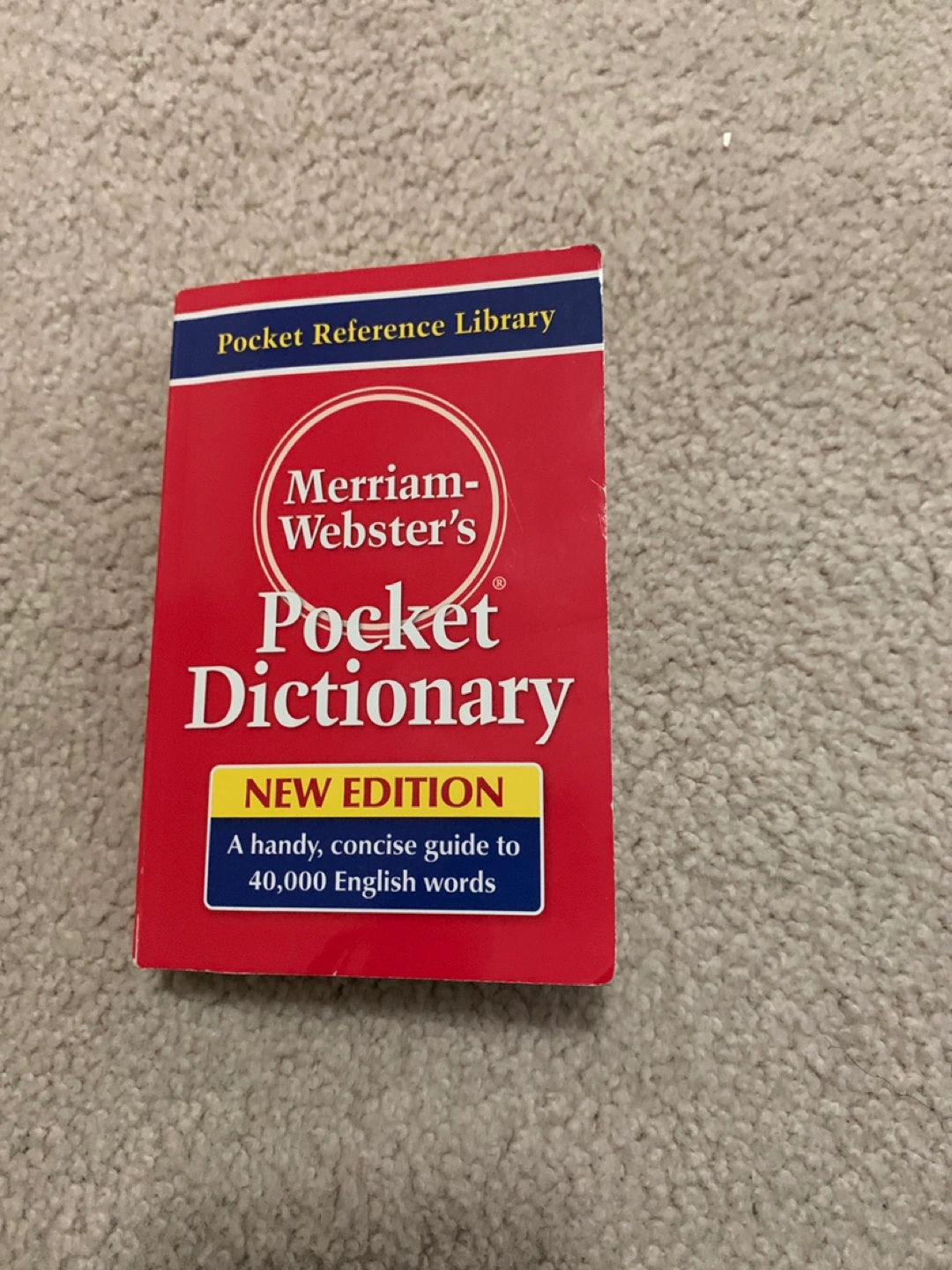 I'm selling a Merriam-Webster's Pocket Dictionary, New Edition. It's a handy, concise guide to 40,000 English words. It's packed with information about the words most commonly used in speech and writing. It includes 40,000 entries with clear definitions, pronunciations, common abbreviations, and a brief guide to punctuation. Originally bought for $8.95