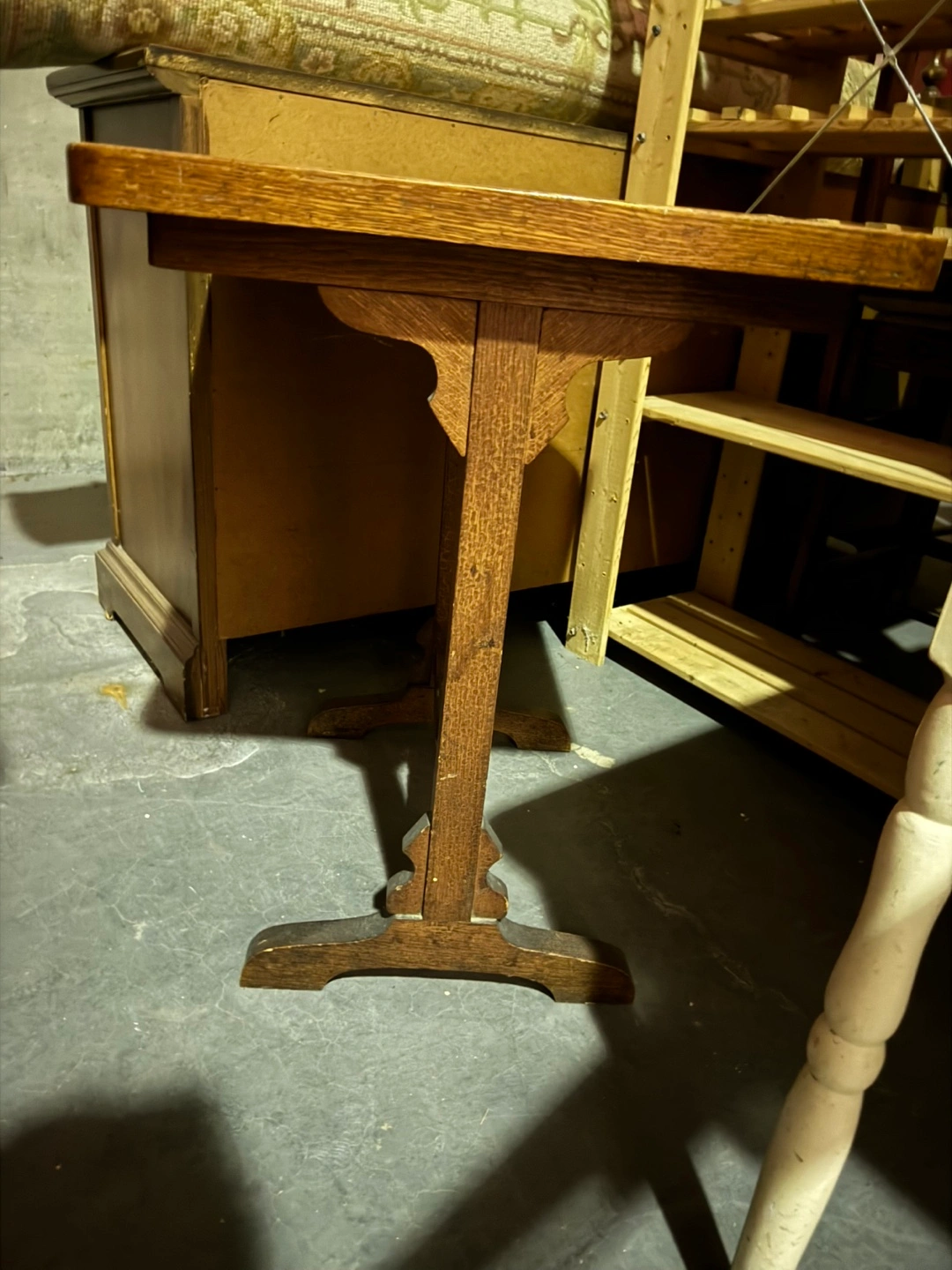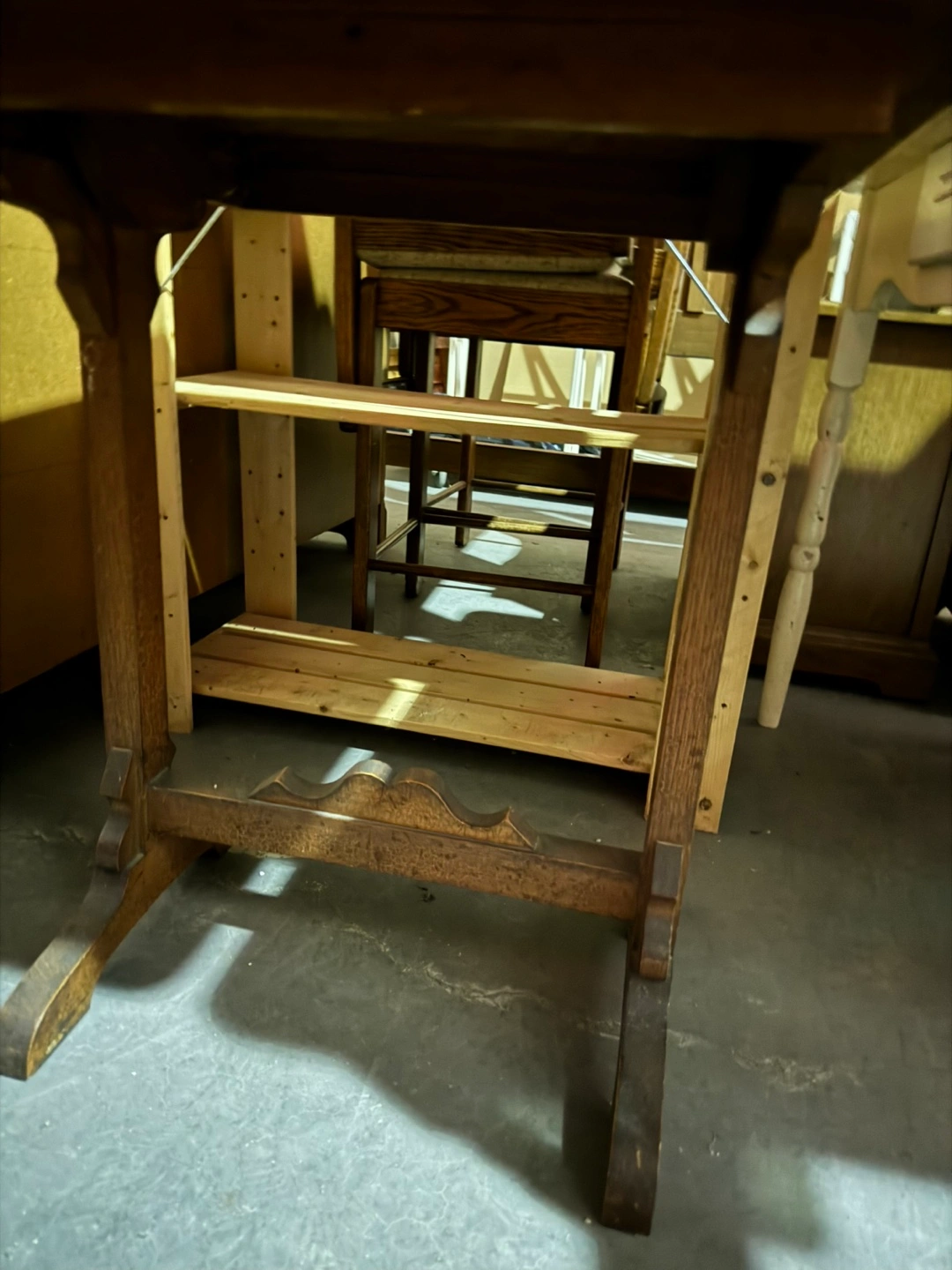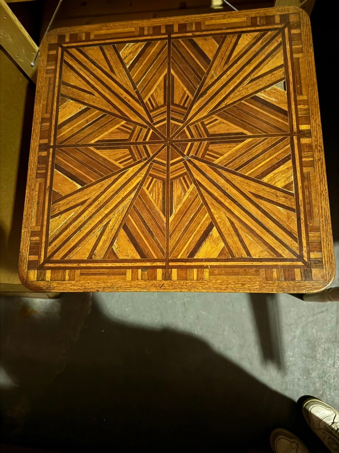 Selling a vintage wooden side table. It's a unique piece with beautiful colors and patterned top and sturdy construction. Perfect for adding a touch of character to any room in your home!