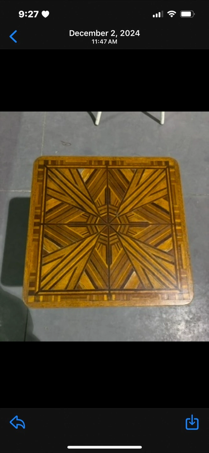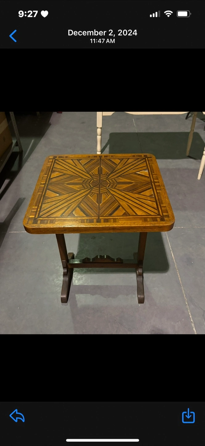 Selling a vintage wooden side table. It's a unique piece with beautiful colors and patterned top and sturdy construction. Perfect for adding a touch of character to any room in your home!