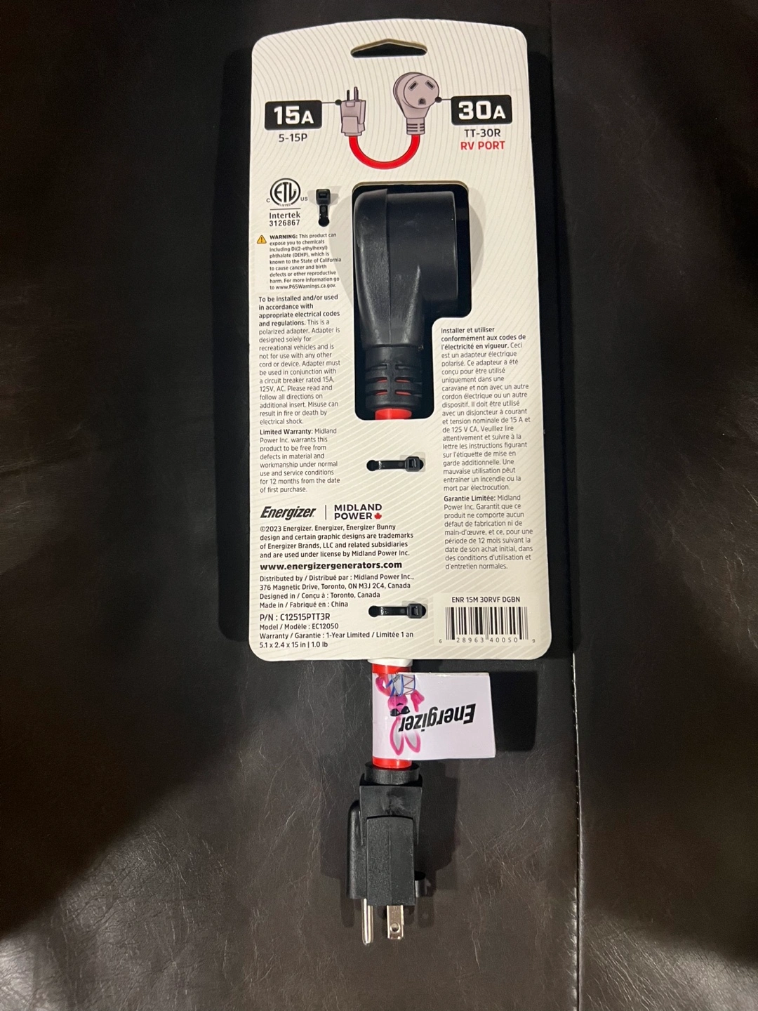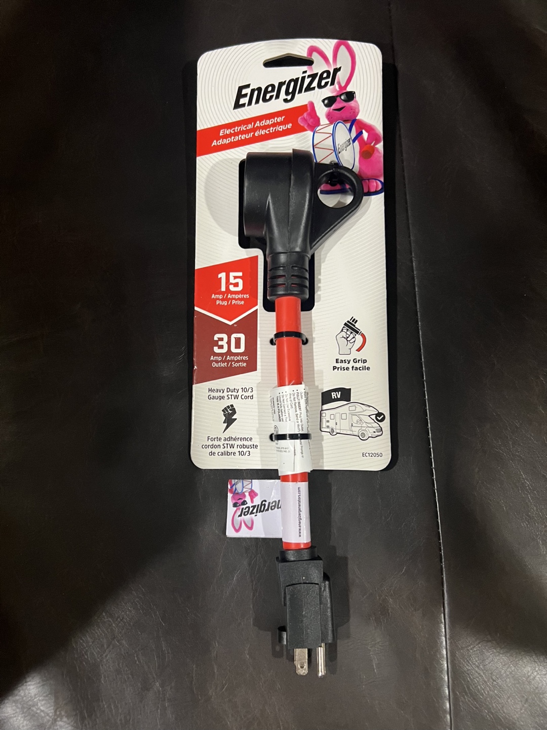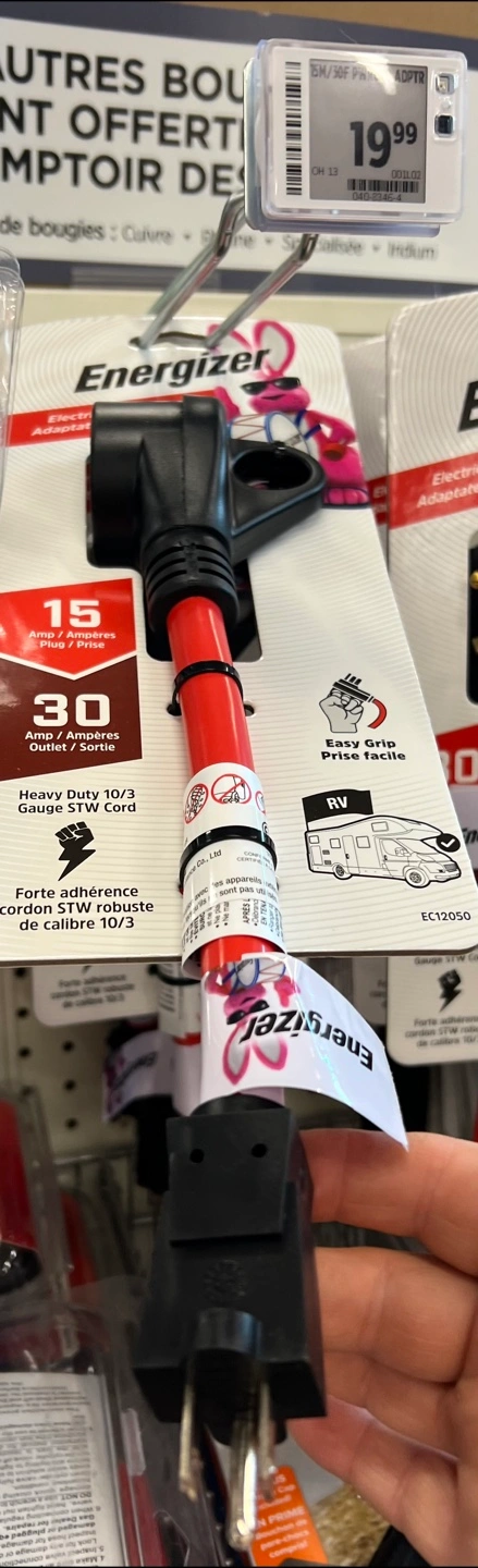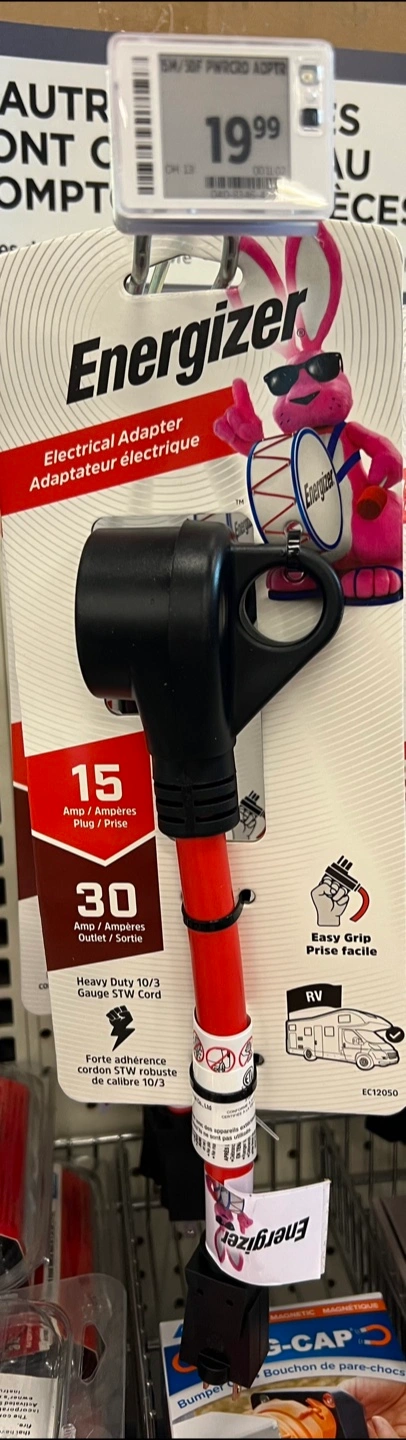 I'm selling a brand new Energizer Electrical Adapter! It converts 15 Amp to 30 Amp, perfect for RVs. It features an easy grip and a heavy-duty 10/3 STW cord. This adapter is new in its original packaging and was originally bought for $19.99