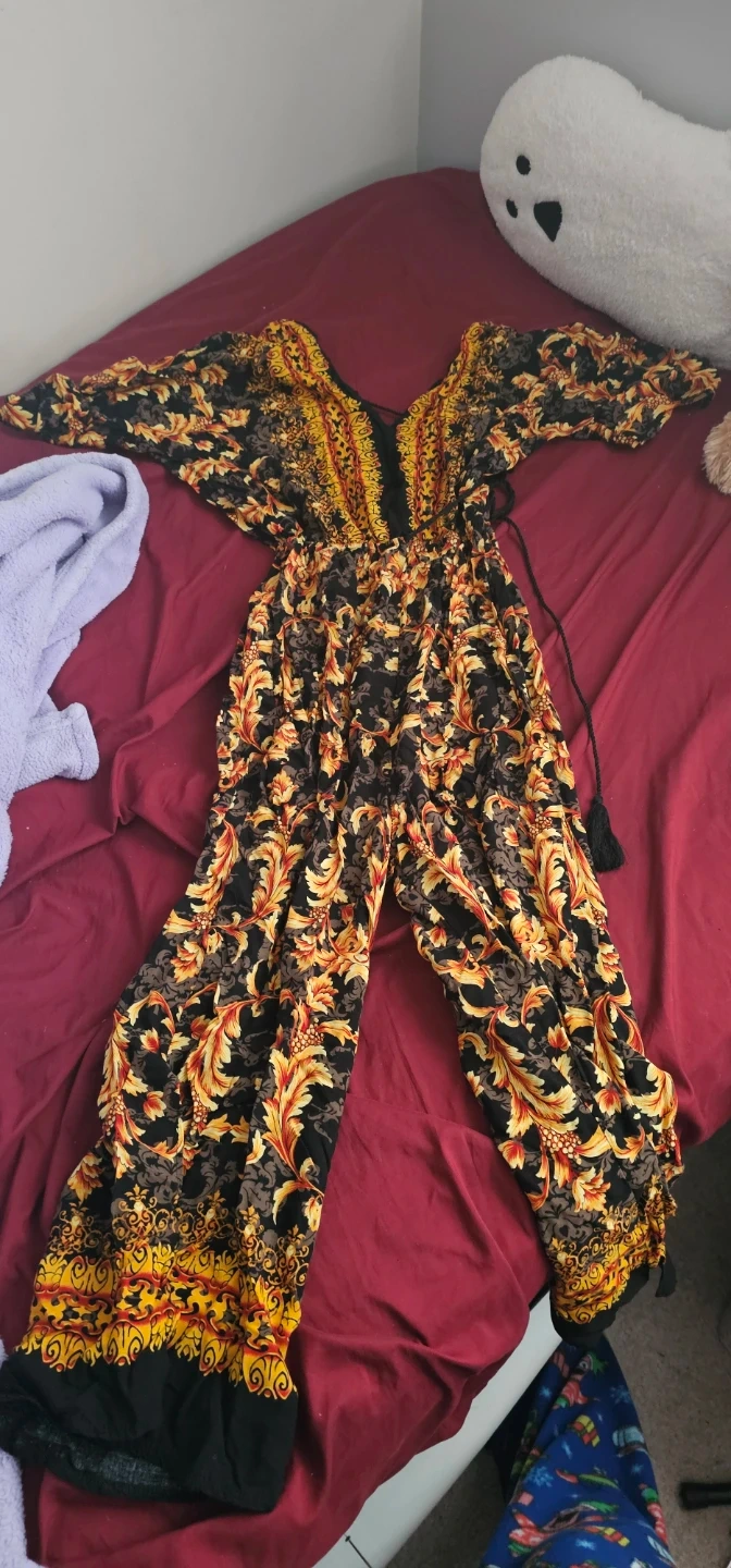 A flowy jumpsuit with a vibrant all-over print. It features a V-neckline and wide legs. The fabric is lightweight and comfortable.