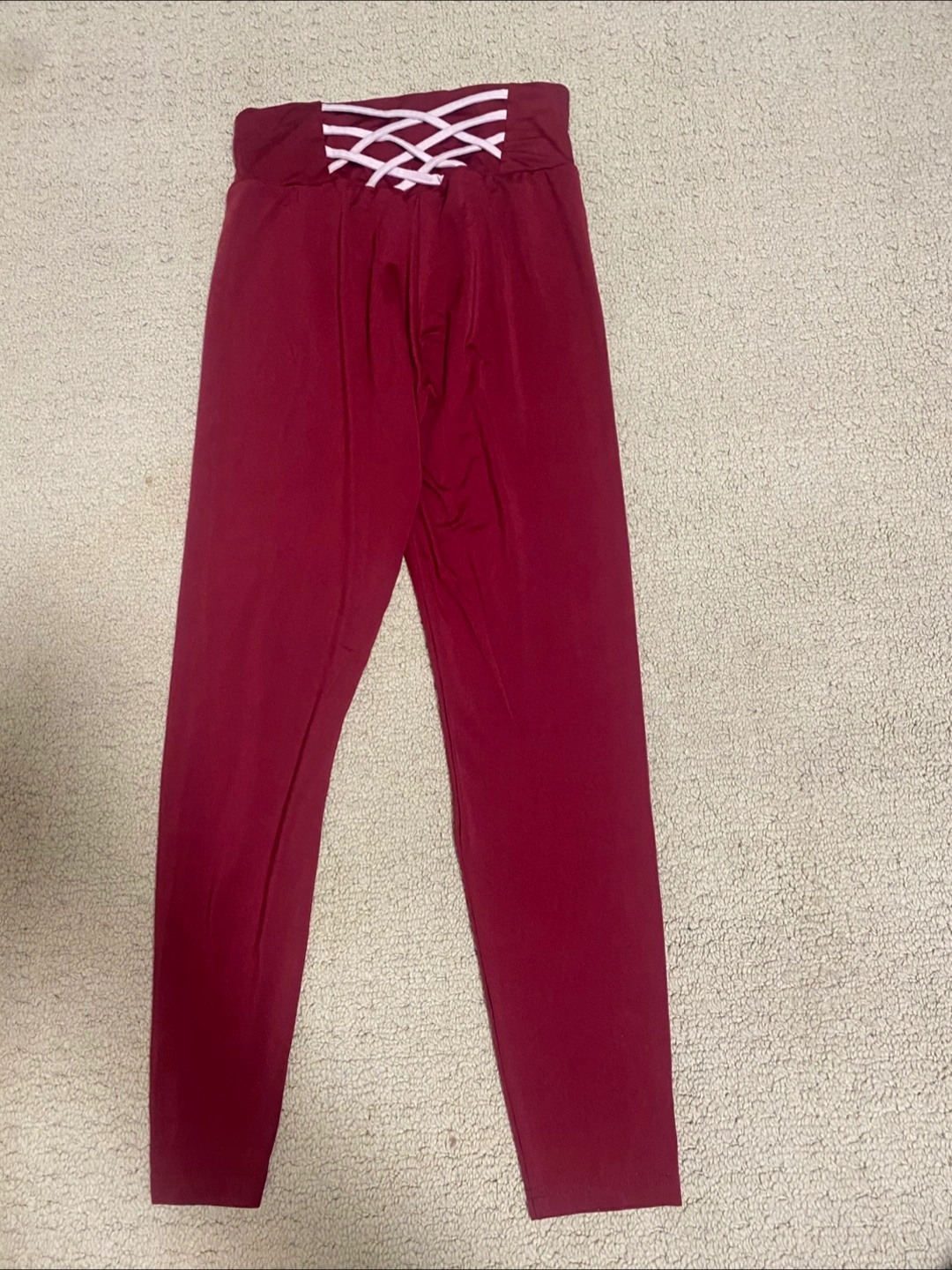 Selling a pair of burgundy leggings. They're in great shape and ready for a new home! The leggings feature a unique criss-cross design at the back, adding a touch of style to your workout or casual wear. Size small