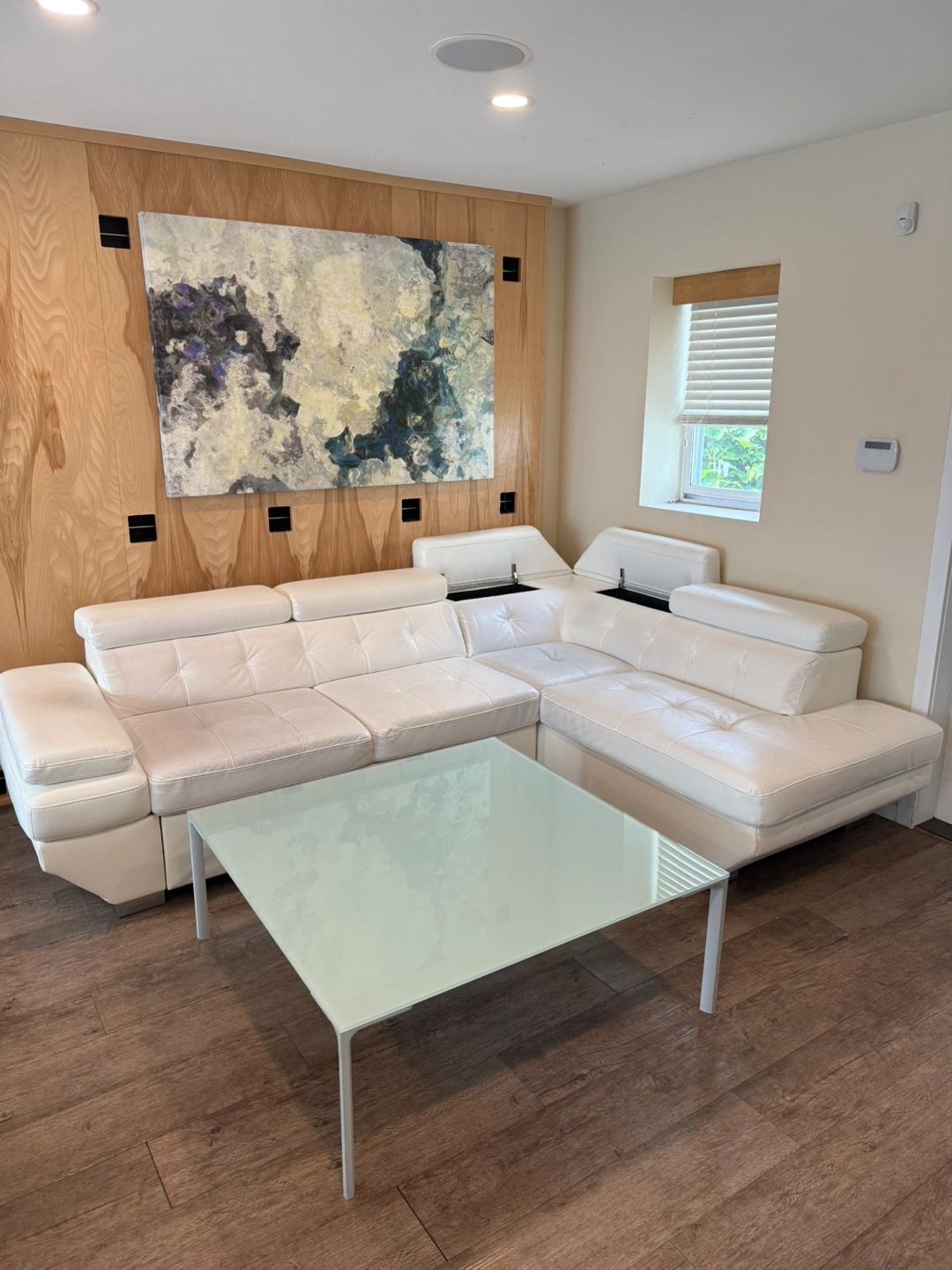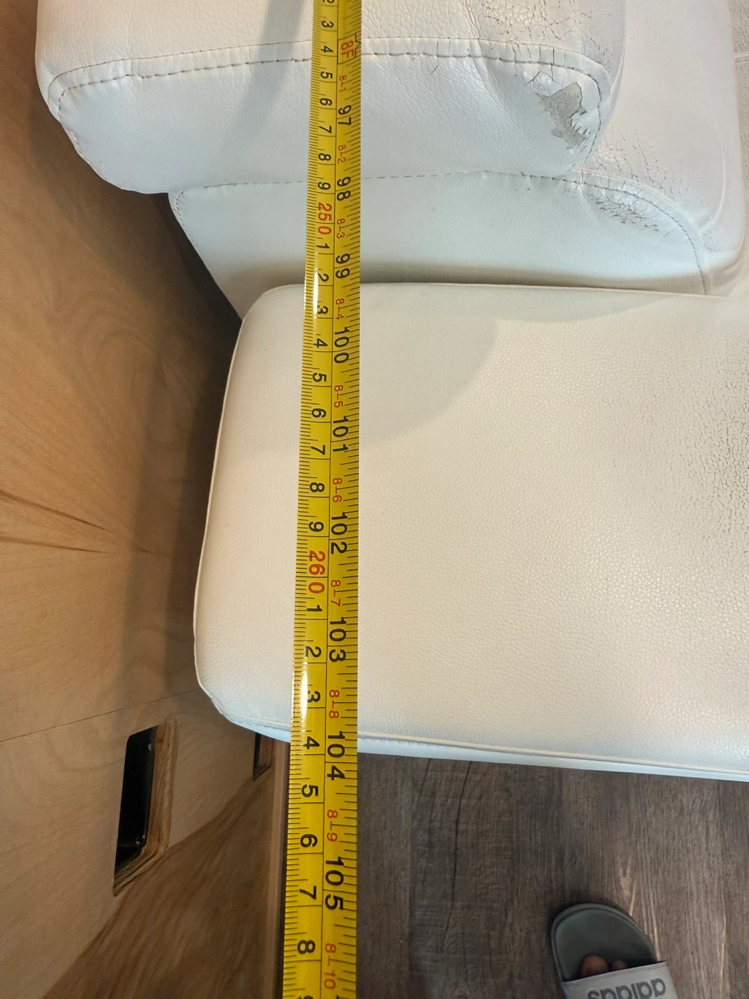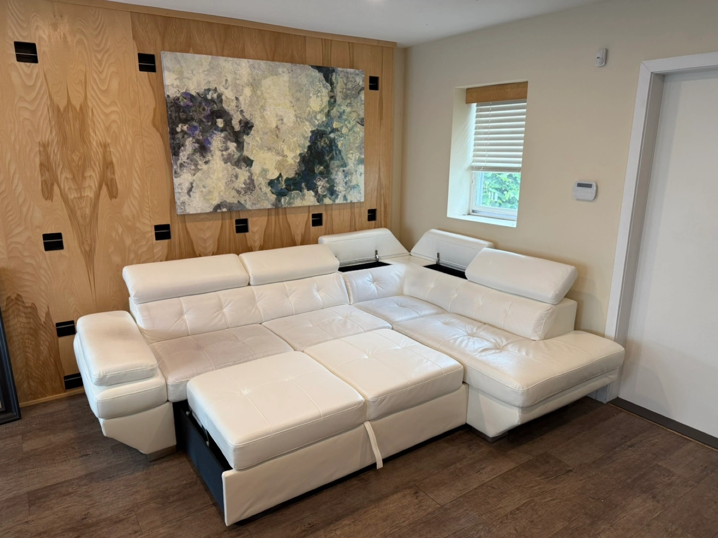 Beautiful white leather sectional sofa that easily converts into a spacious bed. Features adjustable headrests and a sleek modern design. Comfortable and stylish, perfect for living rooms or guest rooms.