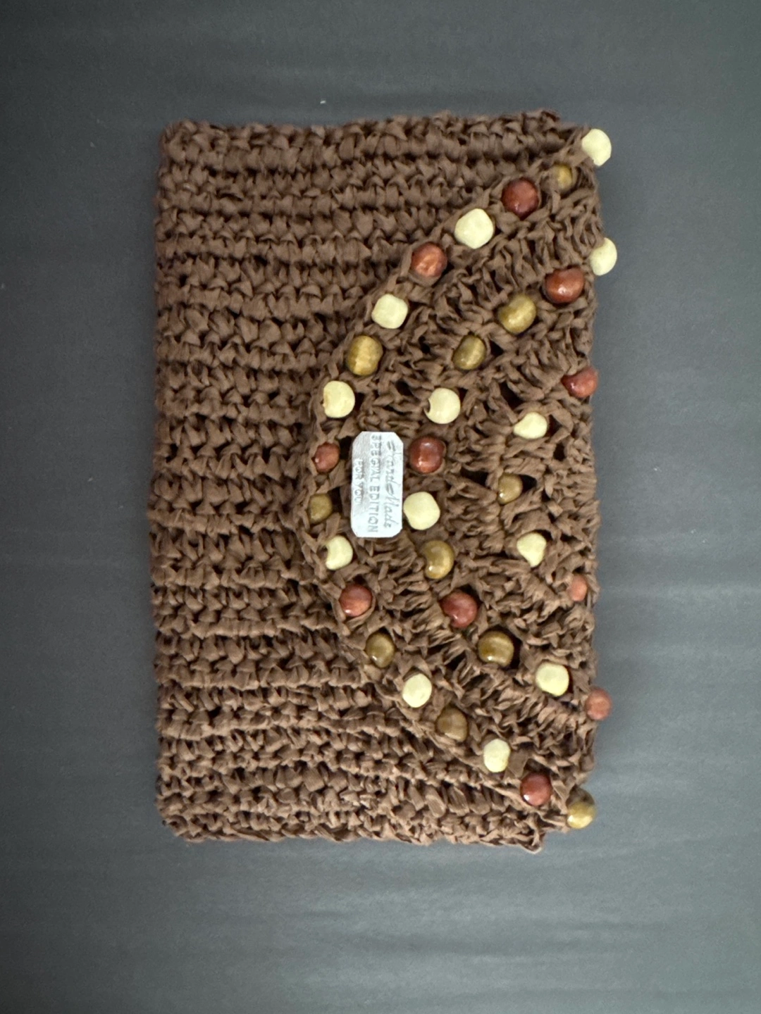621This is a lovely brown clutch with beaded detailing. It's a special edition piece and has a unique, handcrafted feel. Perfect for adding a touch of style to any outfit!