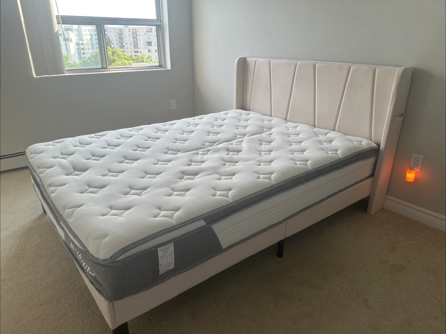This is a queen-sized upholstered bed with a frame in a neutral beige colour. The headboard has a modern, paneled design. It can support a maximum weight of 800 lbs. The bed frame dimensions are approximately 82.3 inches in length and 62.5 inches in width, with a headboard height of 41.3 inches.