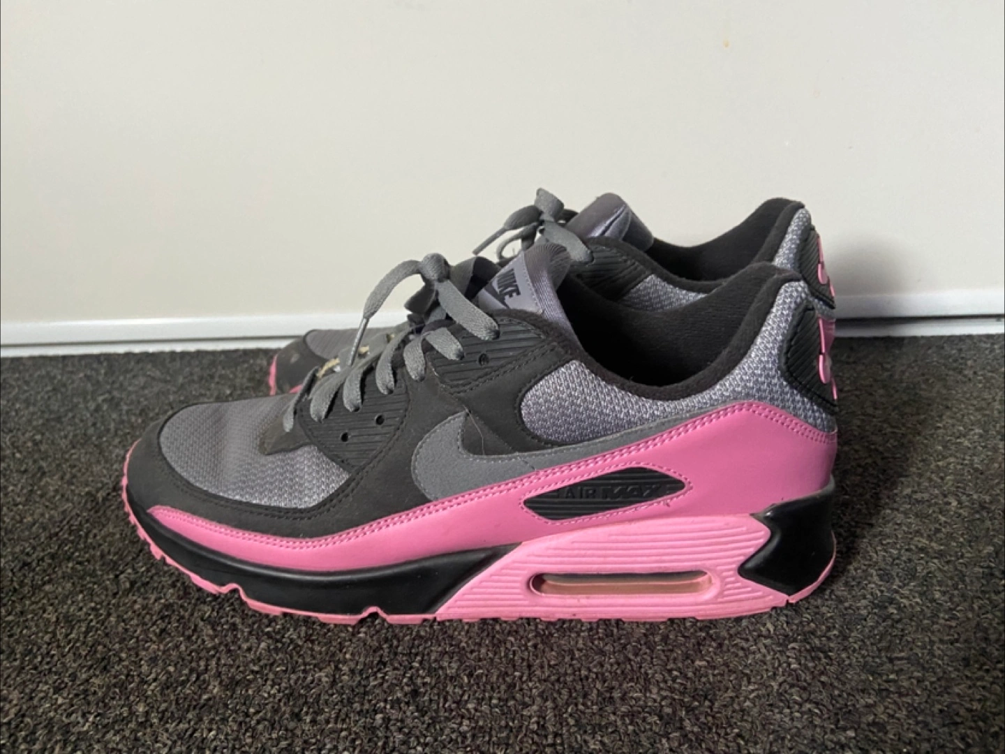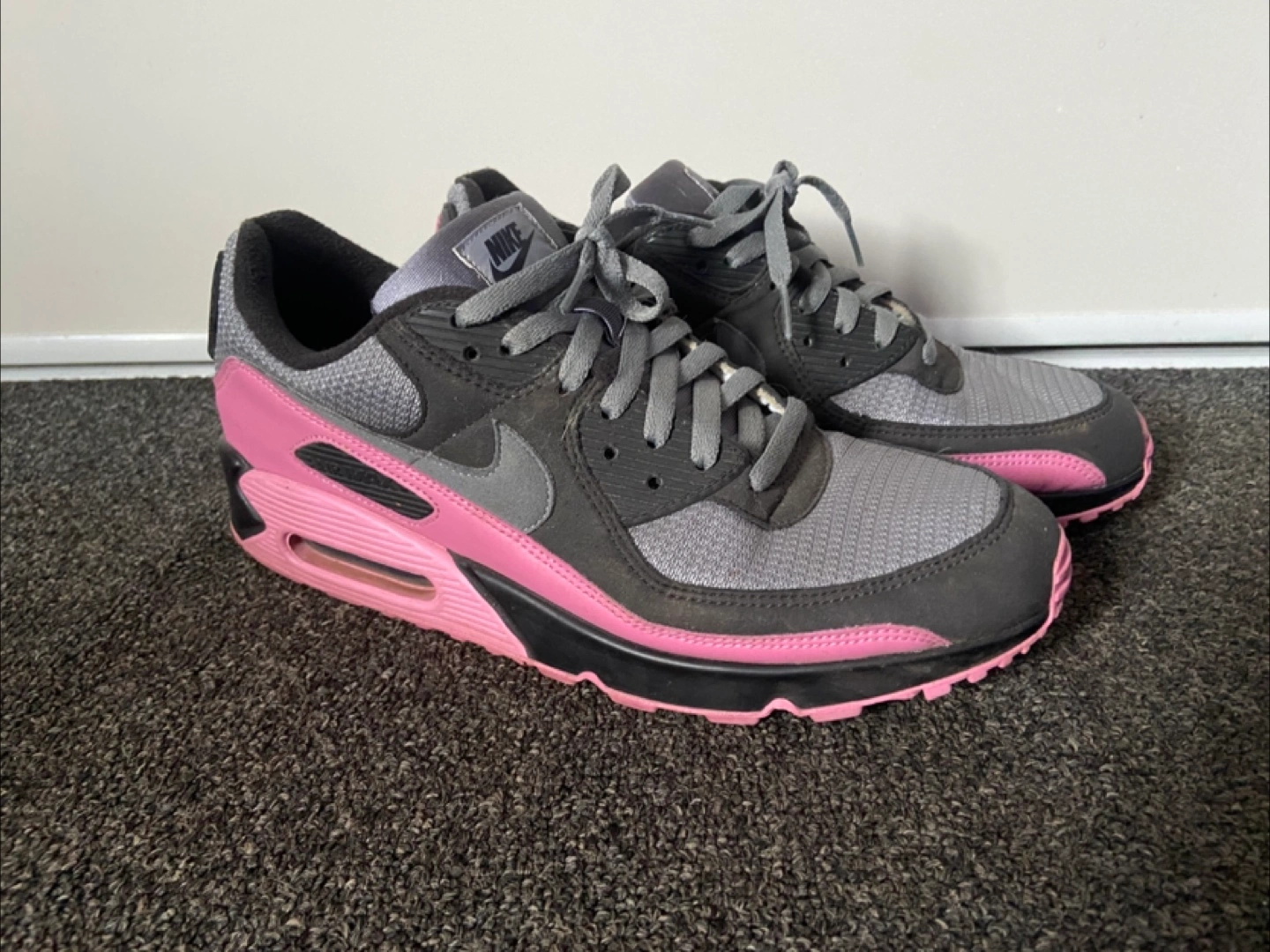 Selling a pair of Nike Air Max 90 sneakers in a stylish grey and pink colourway. They're in very good, barely used condition and ready for a new home. $100 OBO!