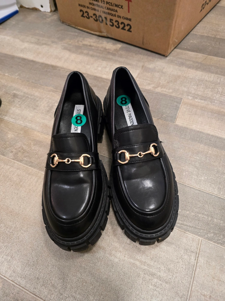 Here are some Steve Madden black loafers in a size 8! They feature a gold-toned horsebit detail and a chunky lug sole. These would be a great addition to your wardrobe