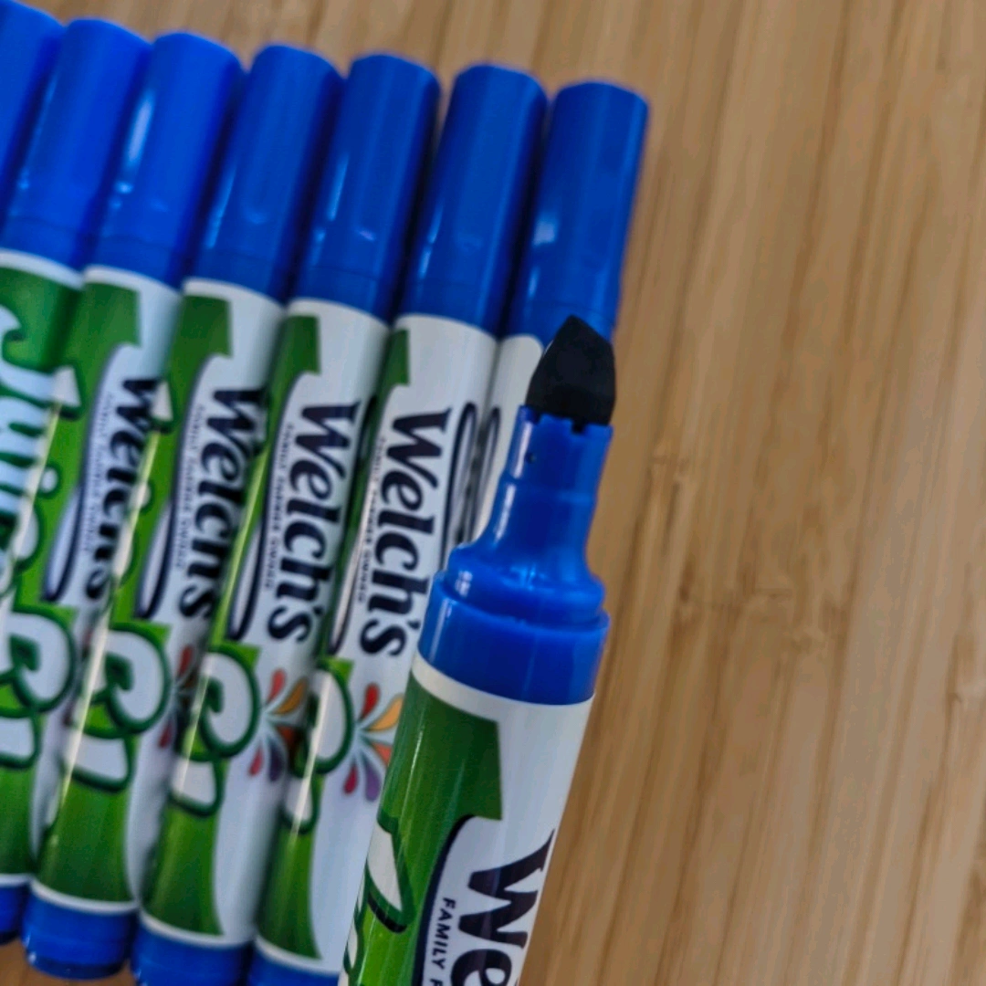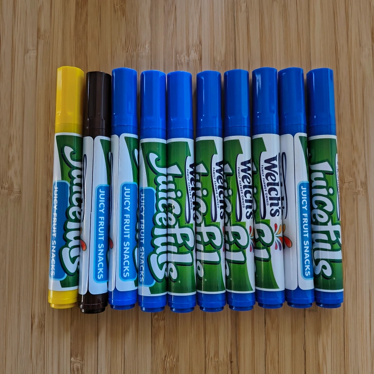 A set of Markers that was promo for Welch's Fruit Snacks. There's 8 Blue color markers, 1 Yellow and 1 Brown. They are brand new and never used. Perfect for back to school activities.