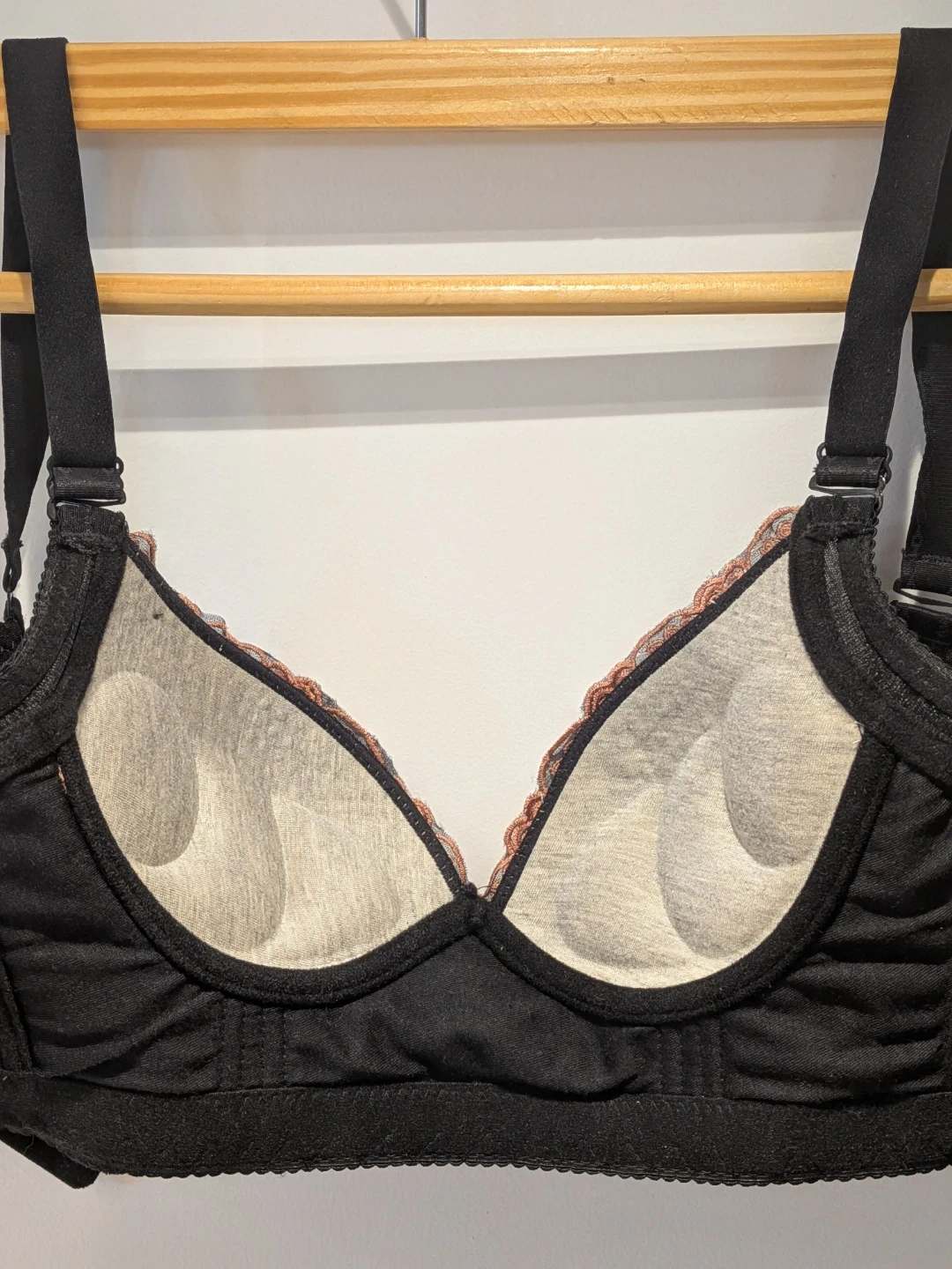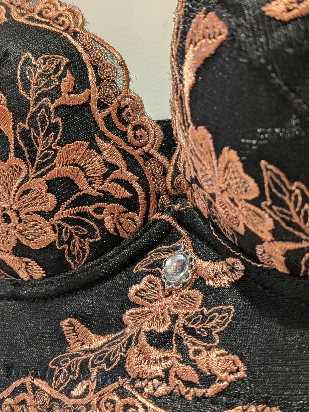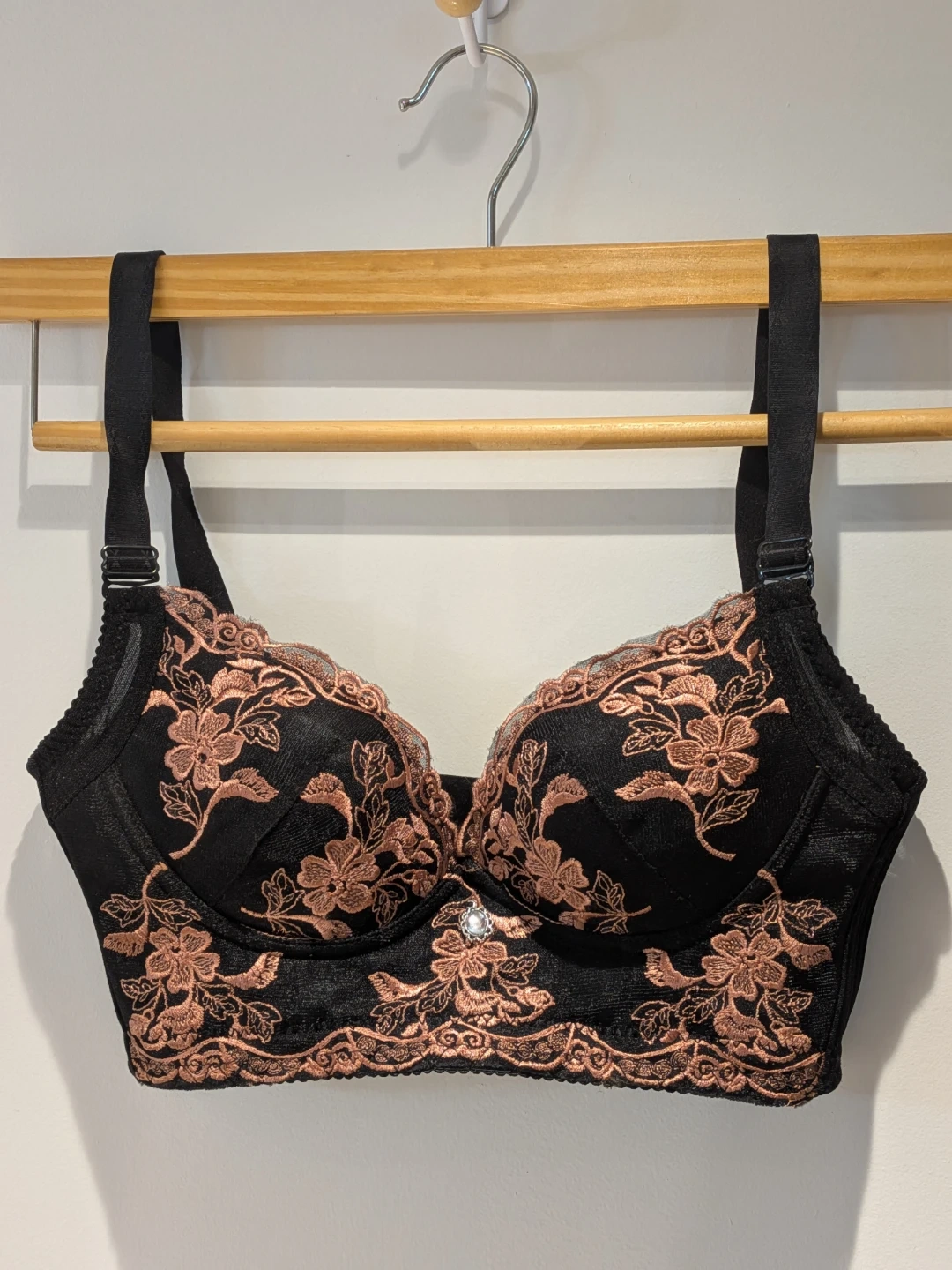 πΈ Very cute bustier bra! Dusty rose embroidery of lil flowers, leaves and rosette borders~ Cups are padded with soft grey jersey material. Little twinkly jewel detail dangles at the sternum for a lil added interest~