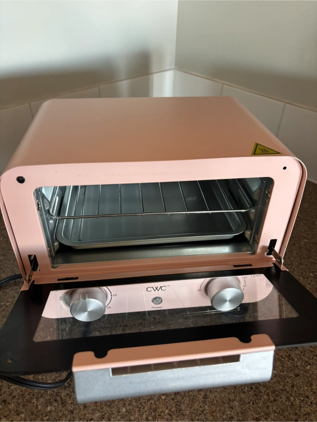 This is a CWC mini toaster oven in a lovely pink colour. It has two knobs for time and temperature control. The oven includes a rack and a baking tray. It's perfect for small kitchens or dorm rooms!