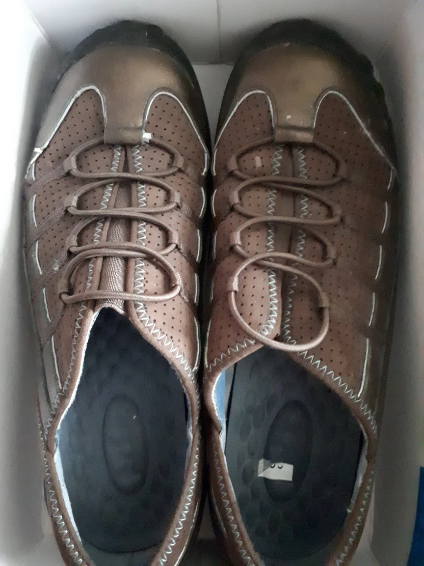 These brown leather walking shoes are in good condition. They're perfect for everyday wear or light hiking. The soles provide great traction, and the leather is durable and comfortable
