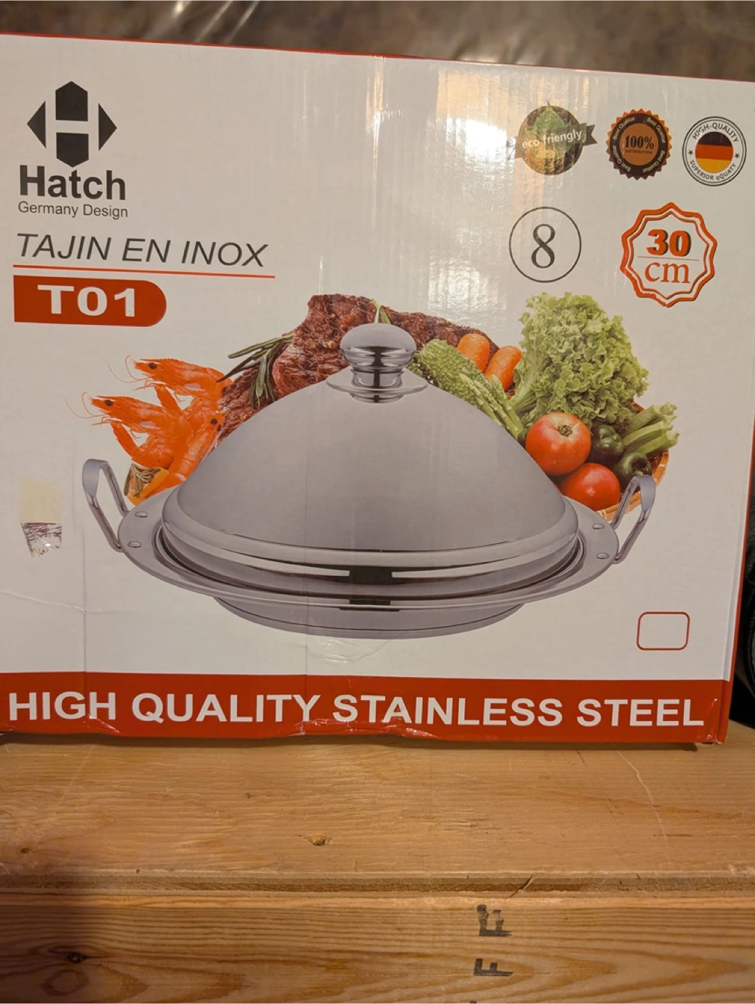 Selling a Hatch Tajin En Inox T01. It's a high-quality stainless steel tajin with a diameter of 30cm. The box indicates it's an eco-friendly design from Germany
