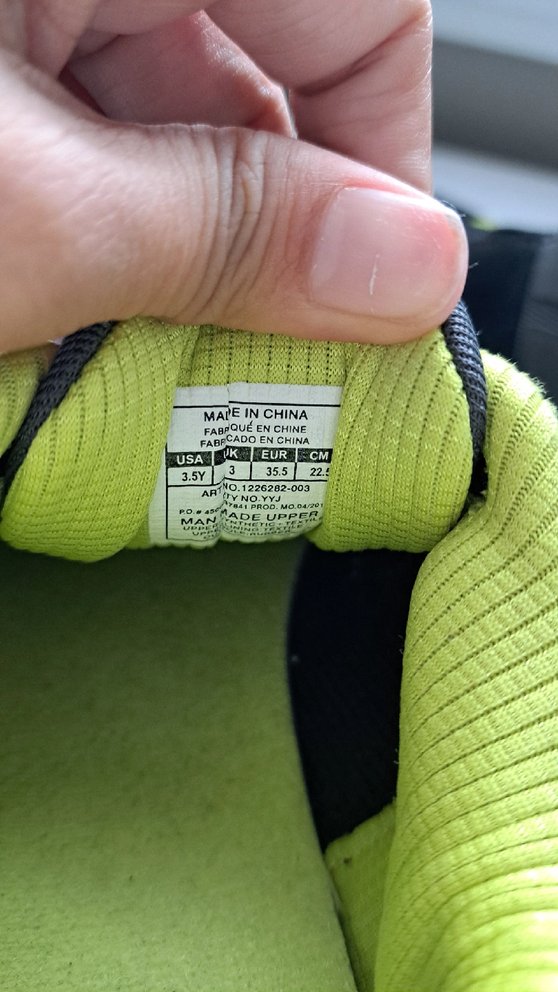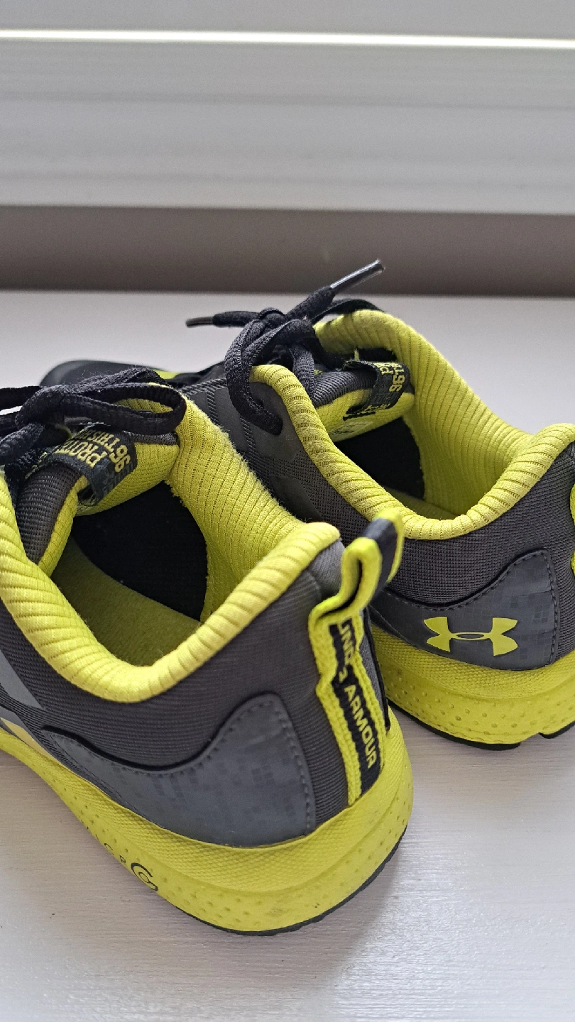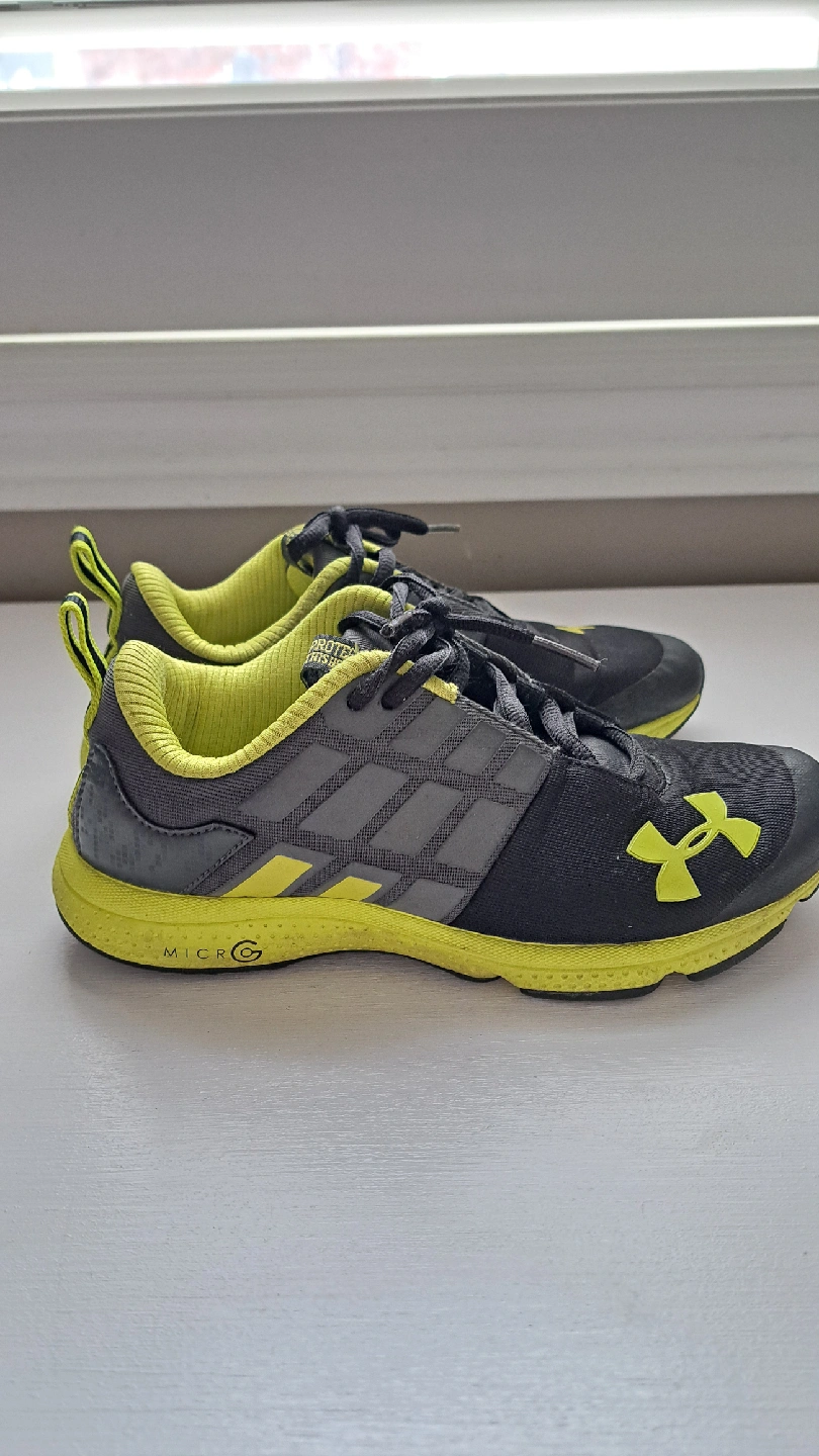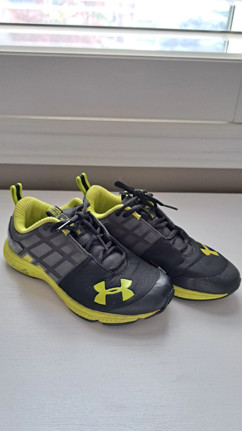 Selling a pair of Under Armour Assert 9 youth running shoes in size 3.5Y. They're in great shape and ready for a new owner! The shoes feature a black and grey design with vibrant yellow accents.