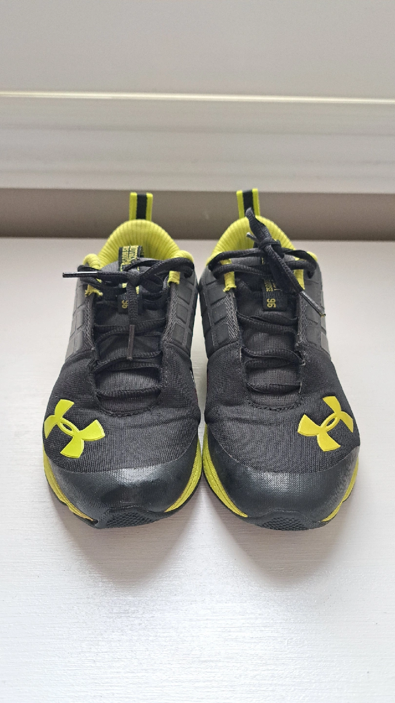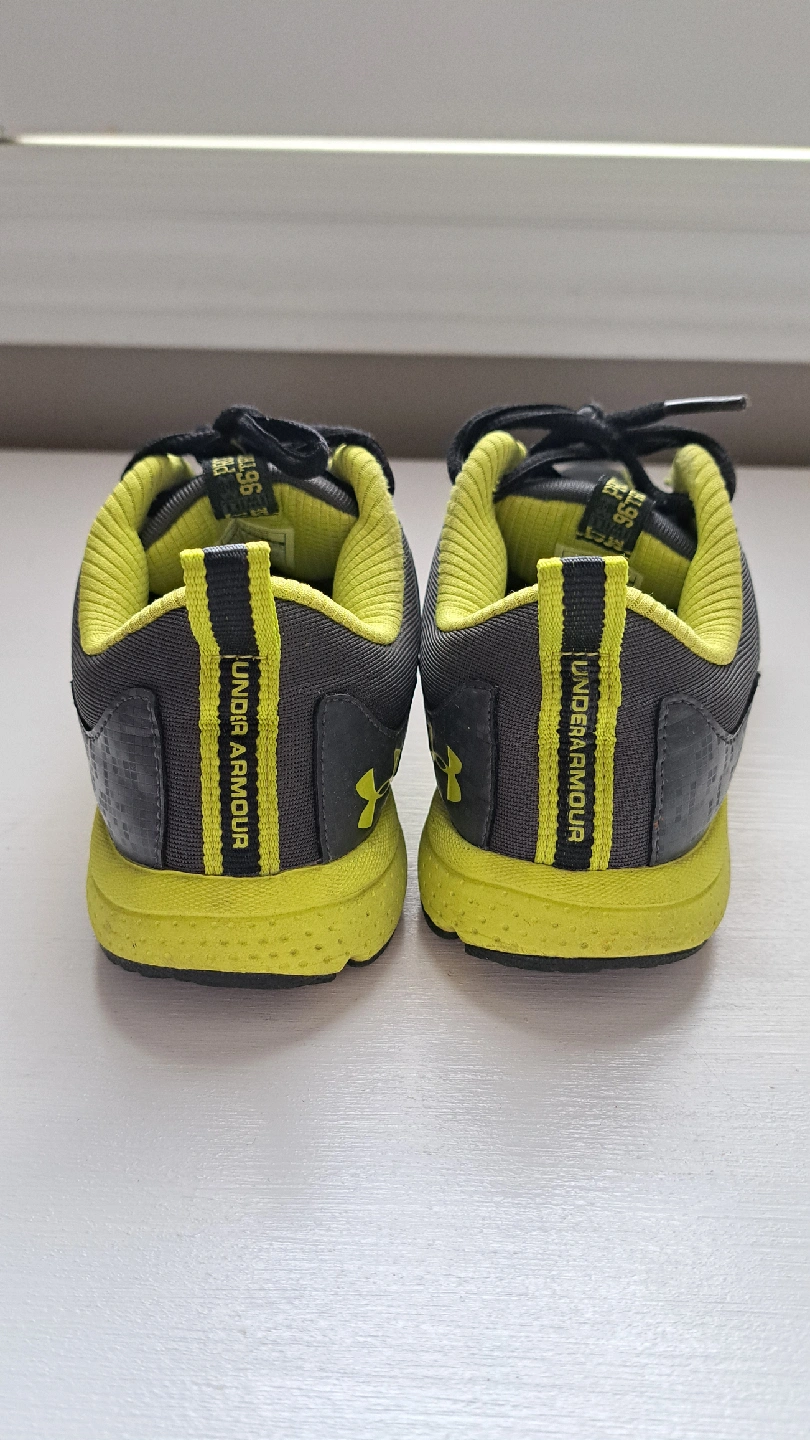 Selling a pair of Under Armour Assert 9 youth running shoes in size 3.5Y. They're in great shape and ready for a new owner! The shoes feature a black and grey design with vibrant yellow accents.