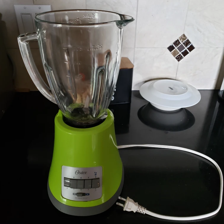 offering used Oster blender. It's in good condition, but needs a lid. then it's ready to whip up your favourite smoothies or sauces! The base is a vibrant green colour, adding a pop of fun to your kitchen. It features multiple speed settings for versatile blending options