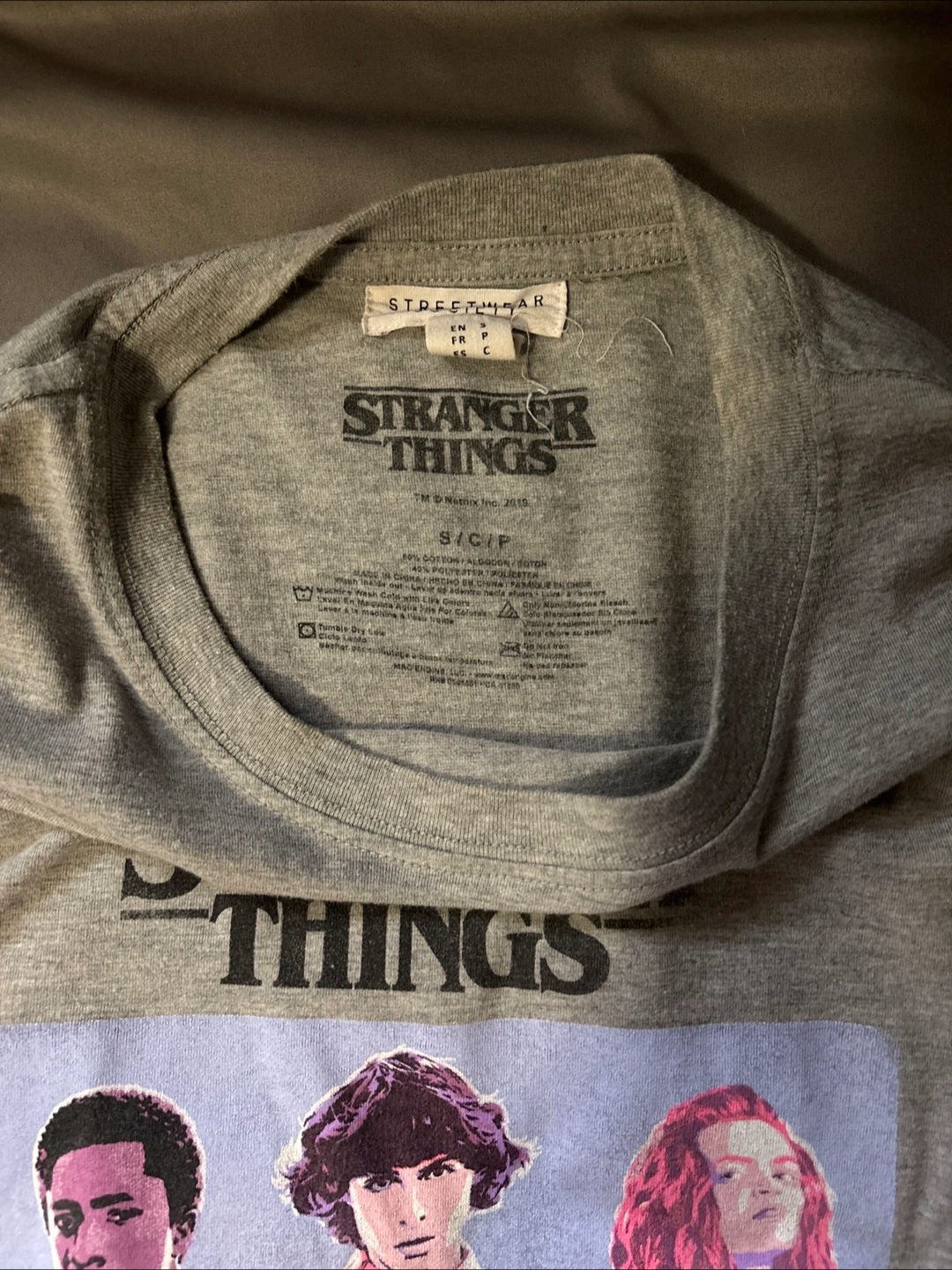 Selling a Stranger Things long sleeve shirt in size small. It's a grey colour and features a graphic print on the front. Perfect for any fan of the show!
