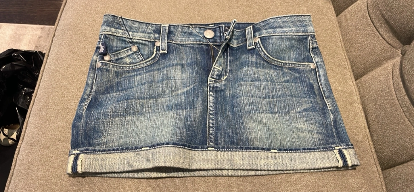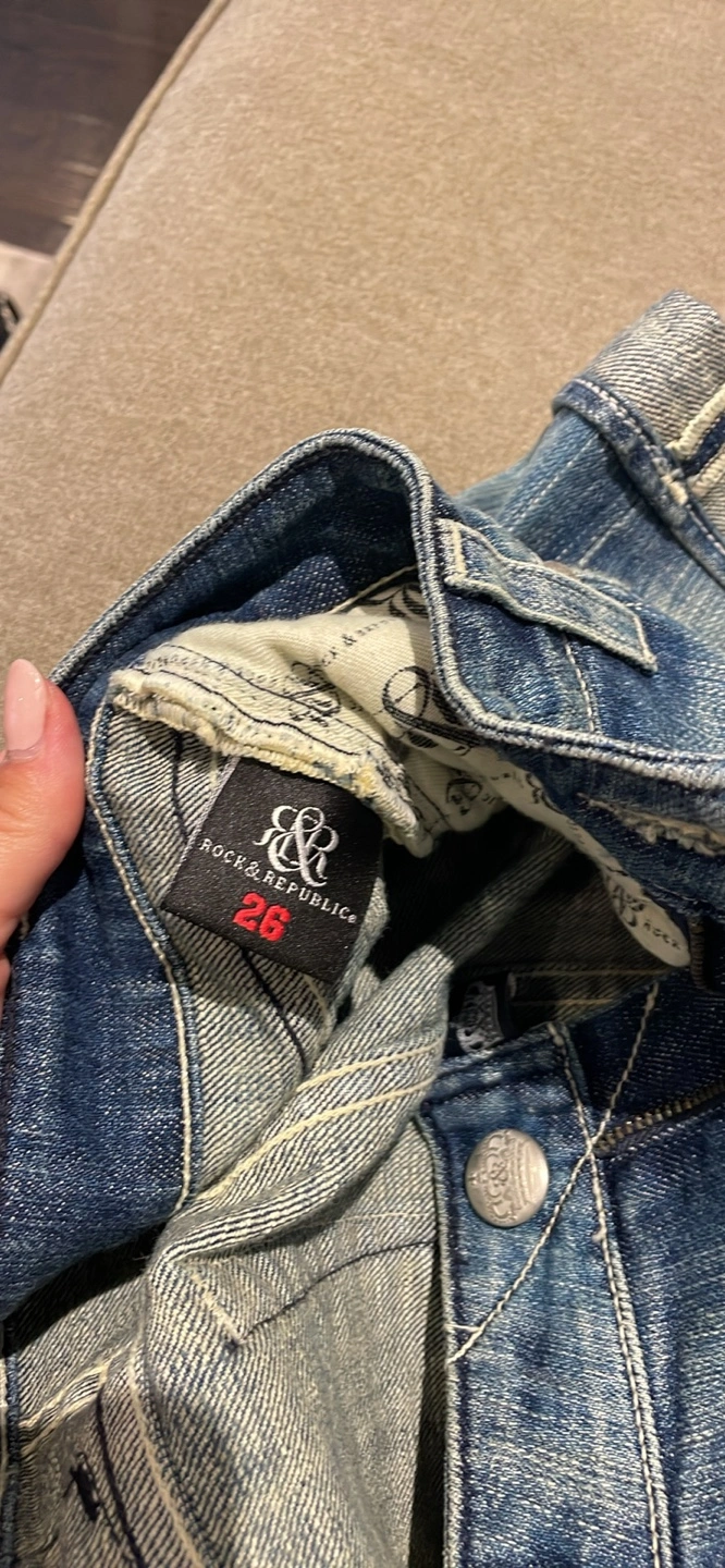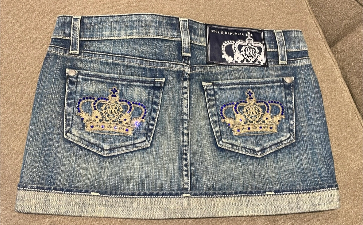 Cute Rock & Republic denim mini skirt in size 26! It features a classic denim wash and stylish details like the logo on the back. Perfect for a casual, trendy look!