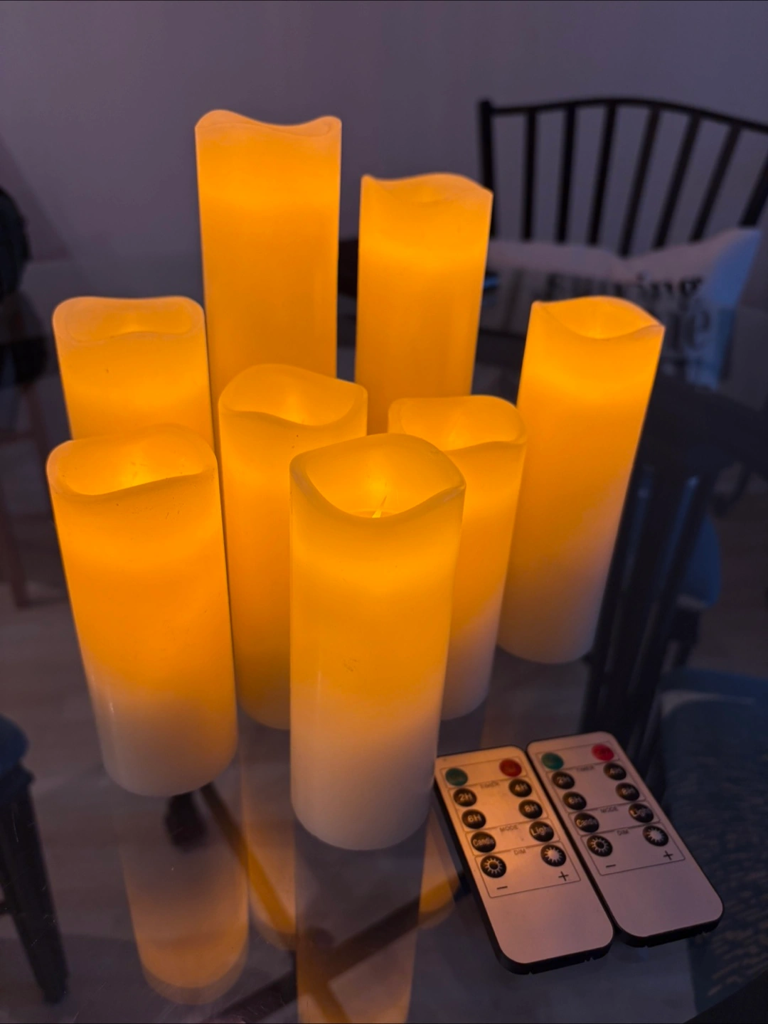 Add a warm glow to any room with this set of 8 flameless LED candles ranging from 5-8.5” tall! These candles offer a safe and convenient alternative to traditional candles, perfect for creating a cozy atmosphere without the worry of fire hazards. Each candle is battery-operated (2 AA each) and comes with 2 remote controls for easy operation.