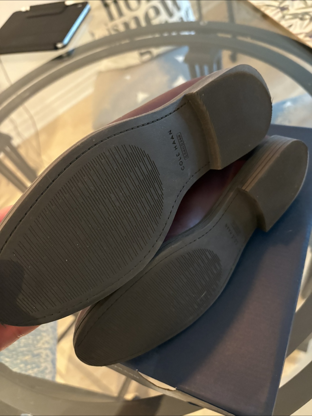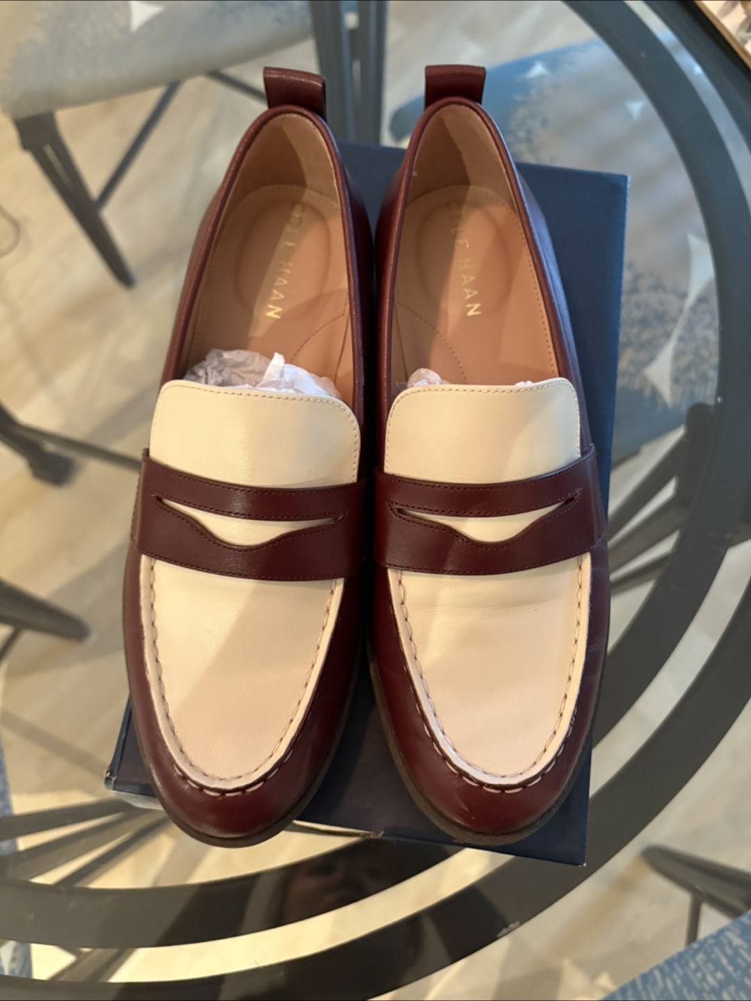 Selling a pair of Cole Haan Stassi Penny Loafers in size 6.5. These loafers are a bloodstone/ivory colour combination. Comes with the original box. Only ever tried on in the house. Selling bc the style is not for me despite how much I like them!
