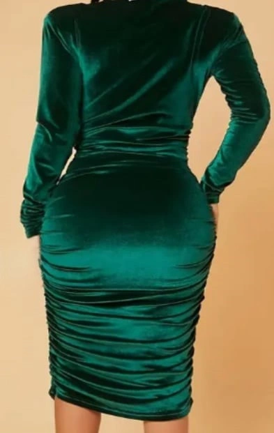 This elegant dark emerald green velvet bodycon midi dress with long sleeves, V-neck design and solid color knit fabric is great for daily wear, formal occasion, party, club, night out, evening, wedding. Simple yet flattering dress, styling with high heels and shiny accessories will look more great, create chic sexy elegance. 100% Polyester. Midi. Bodycon. Micro Elasticity.