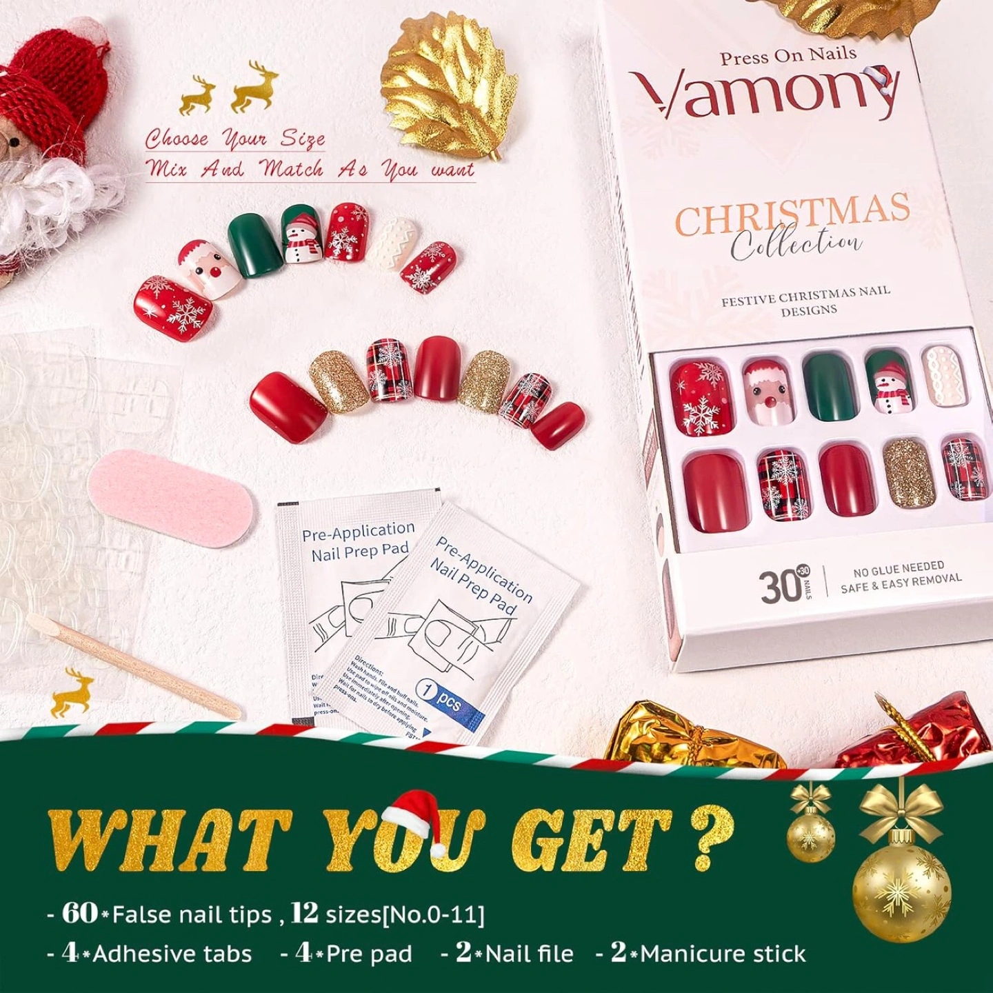 🎄HOLIDAY PRESS ON NAILS ARE HERE: Vamony press ons kit includes 60 square short fake nails (reusable), pre pad, adhesive tabs, manicure stick and mini file. No need to buy other things, you can get the nail salon-like effect.